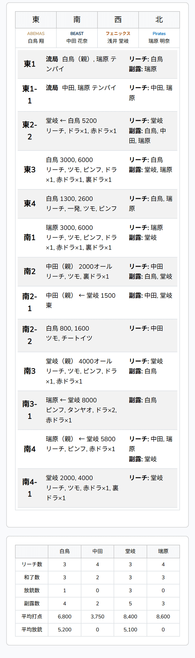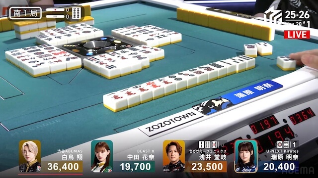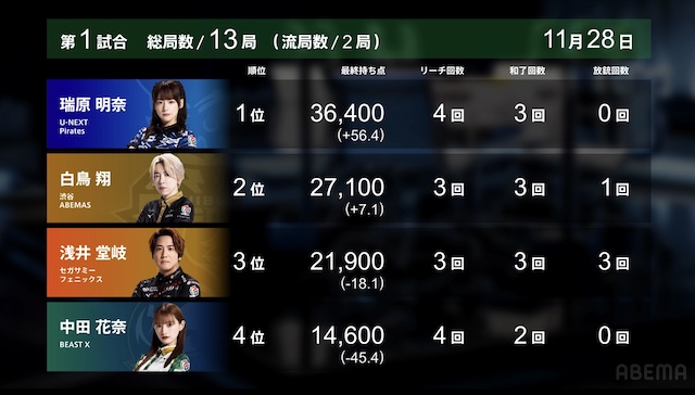 タンキでファーストテンパイ。瑞原が門前で追いつき、リーチで攻勢に出た。トップ目の白鳥を追う2番手の対決は、瑞原がツモアガリ。3000・6000でトップ目まで駆け上がった。