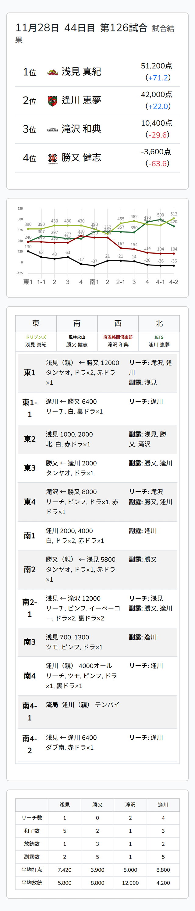 Mリーグ試合速報 11/28 LIVEch 第1試合【浅見・勝又・滝沢・逢川】麻雀ウォッチ編集部2025年11月28日Mリーグ速報 第1試合結果記事 【11/28 Mリーグ2025-26 第1試合結果】麻雀chは南3局、南4局の連続アガリで抜け出した瑞原明奈、LIVEchは高打点多発の激戦を制した浅見真紀がトップ獲得! 第2試合結果記事 【11/28 Mリーグ2025-26 第2試合結果】麻雀chは南場にアガリを重ねた多井隆晴、LIVEchは東1局の6000オールで抜け出しその後も局消化を重ねた高宮まりがトップ獲得!麻雀格闘倶楽部が再び首位浮上! 第1試合詳細結果 ©ABEMA 第1試合終了時点のトータルランキング ©ABEMA ▼日程・結果 日程・結果【Mリーグ】-2025-26SEASON ▼選手・チーム成績スタッツ 成績・データ【Mリーグ 2025-26シーズン】 2025年11月27日Mリーグ試合速報 11/27 麻雀ch 第2試合【小林・内川・阿久津・下石】2025年11月28日Mリーグ試合速報 11/28 麻雀ch 第1試合【白鳥・中田・堂岐・瑞原】この記事のライター麻雀ウォッチ編集部麻雀界の最新ニュース、コラム、インタビュー、ランキング、スケジュールなど、麻雀に関するあらゆる情報を発信する日本最大級の麻雀ニュースサイトです。ライターの最新投稿2025年11月28日Mリーグ【11/28 Mリーグ2025-26 第2試合結果】麻雀chは南場にアガリを重ねた多井隆晴、LIVEc...2025年11月28日Mリーグ【11/28 Mリーグ2025-26 第1試合結果】麻雀chは南3局、南4局の連続アガリで抜け出した瑞...2025年11月28日Mリーグ速報Mリーグ試合速報 11/28 麻雀ch 第2試合【醍醐・仲林・東城・多井】麻雀ウォッチ編集部の記事一覧