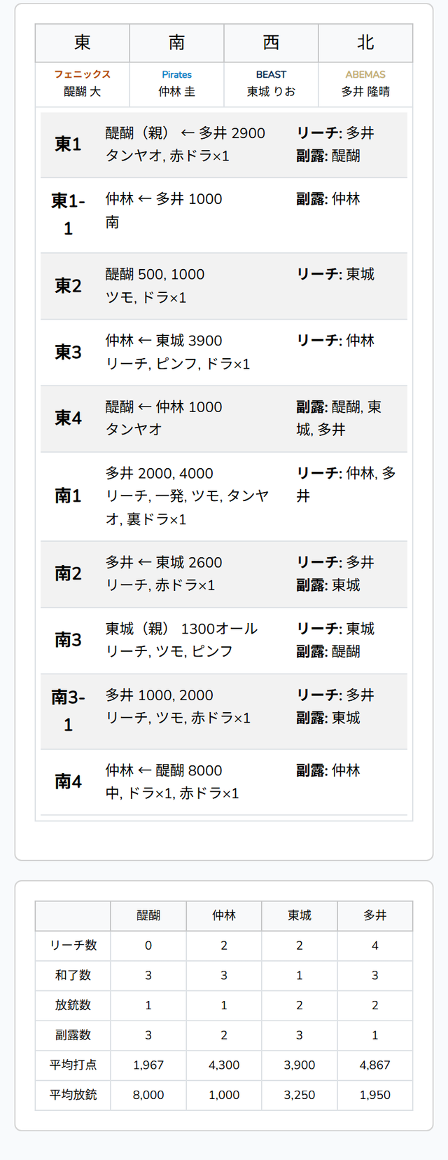 南3局1本場、親の東城が形式テンパイで連荘を目指す中、多井が15巡目に先制リーチで、東城の親落としを図る。東城はオリを選択し、多井がツモアガリ。1000・2000は1100・2100を加点して、トップ目のままオーラスへ。