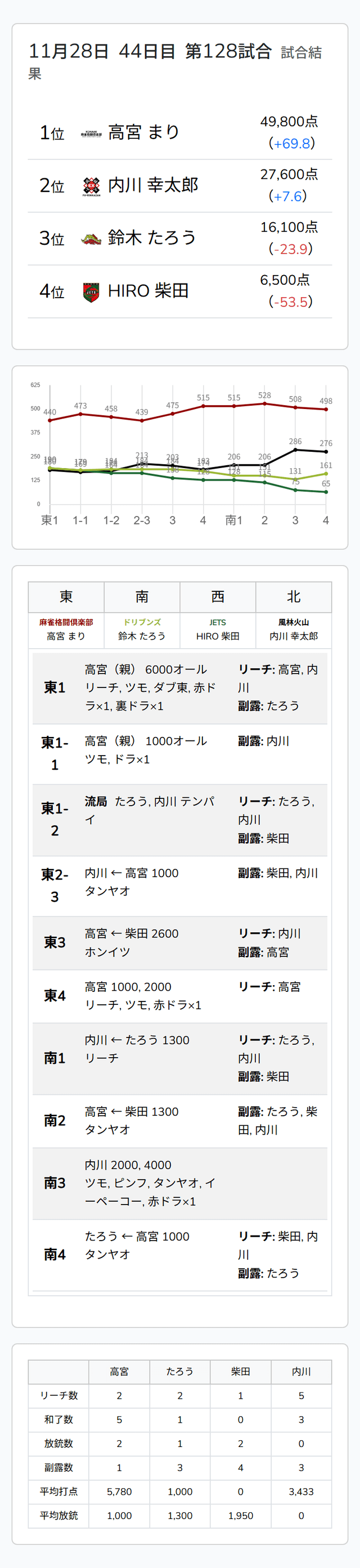 Mリーグ試合速報 11/28 LIVEch 第2試合【高宮・たろう・柴田・内川】麻雀ウォッチ編集部2025年11月28日Mリーグ速報 第1試合結果記事 【11/28 Mリーグ2025-26 第1試合結果】麻雀chは南3局、南4局の連続アガリで抜け出した瑞原明奈、LIVEchは高打点多発の激戦を制した浅見真紀がトップ獲得! 第2試合結果記事 【11/28 Mリーグ2025-26 第2試合結果】麻雀chは南場にアガリを重ねた多井隆晴、LIVEchは東1局の6000オールで抜け出しその後も局消化を重ねた高宮まりがトップ獲得!麻雀格闘倶楽部が再び首位浮上! 第2試合詳細結果 ©ABEMA 第2試合終了時点のトータルランキング ©ABEMA ▼日程・結果 日程・結果【Mリーグ】-2025-26SEASON ▼選手・チーム成績スタッツ 成績・データ【Mリーグ 2025-26シーズン】 2025年11月28日Mリーグ試合速報 11/28 麻雀ch 第1試合【白鳥・中田・堂岐・瑞原】2025年11月28日Mリーグ試合速報 11/28 麻雀ch 第2試合【醍醐・仲林・東城・多井】この記事のライター麻雀ウォッチ編集部麻雀界の最新ニュース、コラム、インタビュー、ランキング、スケジュールなど、麻雀に関するあらゆる情報を発信する日本最大級の麻雀ニュースサイトです。ライターの最新投稿2025年11月28日Mリーグ【11/28 Mリーグ2025-26 第2試合結果】麻雀chは南場にアガリを重ねた多井隆晴、LIVEc...2025年11月28日Mリーグ【11/28 Mリーグ2025-26 第1試合結果】麻雀chは南3局、南4局の連続アガリで抜け出した瑞...2025年11月28日Mリーグ速報Mリーグ試合速報 11/28 麻雀ch 第2試合【醍醐・仲林・東城・多井】麻雀ウォッチ編集部の記事一覧