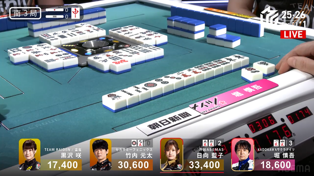 しかし3着目の堀選手が高めチャンタ三色となる??待ちで追いかけリーチ!