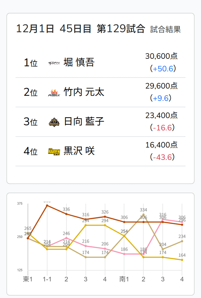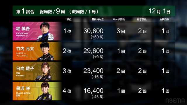 【12/1 Mリーグ2025-26 第1試合結果】至極の読みと圧倒的な手牌構想力!南3局でチャンタ・三色の鮮やかな跳満を決めた堀慎吾がオーラスの親番では他家の降りを見切ってノーテン宣言でトップを獲得!