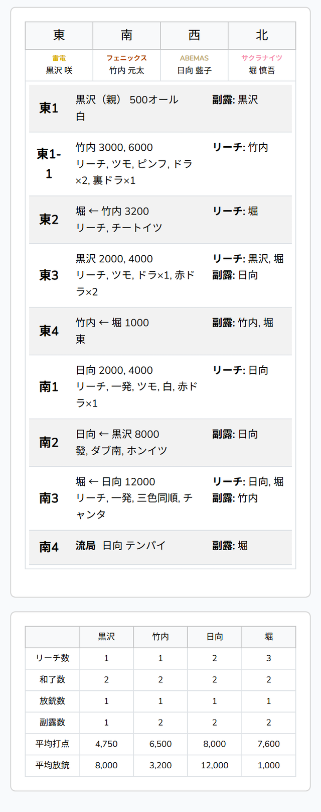 が出て堀のアガリ。堀は跳満のアガリでトップ目に浮上。