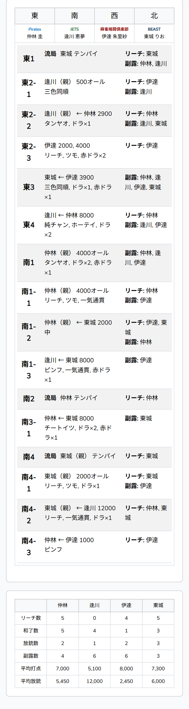 南1局1本場、4着目で親の仲林が門前で一気通貫を完成させると、9巡目に先制リーチ。ツモアガリで、前局に続いて2局連続の4000オールとなった。仲林はトップ目に。