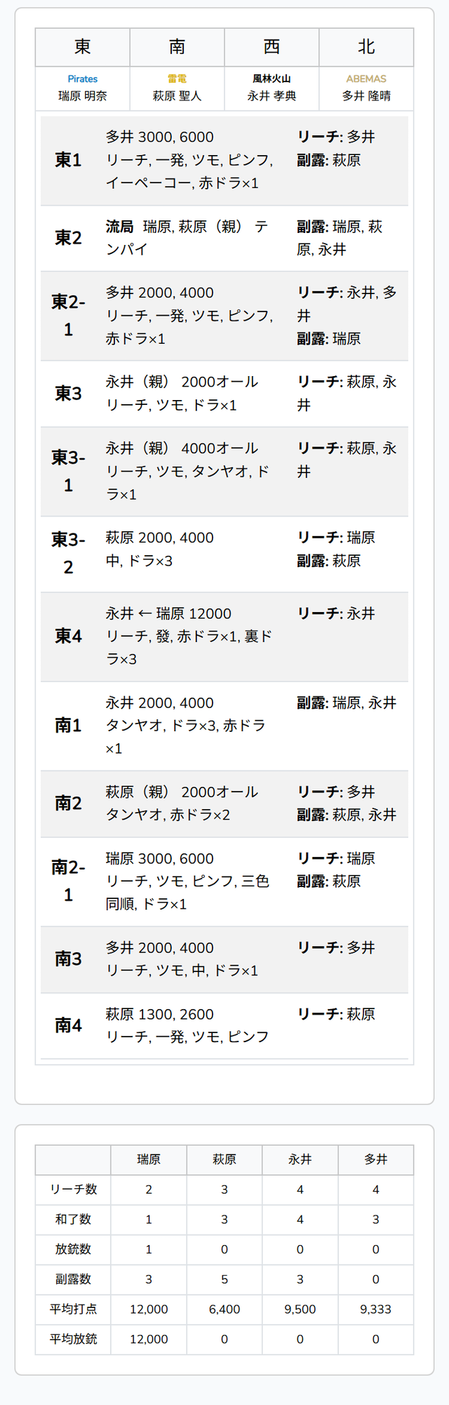 東4局、2着目の永井が5巡目に先制リーチ。チートイツで追いついた瑞原のリーチ宣言牌をとらえると、裏ドラを3枚乗せて12000となった。永井はトップ目に、対照的に瑞原は箱下に沈む。
