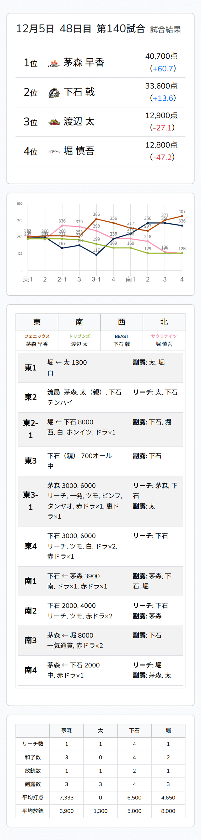 Mリーグ試合速報 12/5 LIVEch 第2試合【茅森・太・下石・堀】麻雀ウォッチ編集部2025年12月5日Mリーグ速報 第1試合結果記事 【12/5 Mリーグ2025-26 第1試合結果】麻雀chは東4局2本場の親満貫ツモで抜け出した本田朋広が接戦を制してトップ!、LIVEchは南場に大きく抜け出した中田花奈がトップ獲得! 第2試合結果記事 【12/5 Mリーグ2025-26 第2試合結果】麻雀chは怒涛の攻勢を見せた永井孝典が個人9勝目!LIVEchは茅森早香が僅差の戦いを制してトップ獲得! 第2試合詳細結果 ©ABEMA 第2試合終了時点のトータルランキング ©ABEMA ▼日程・結果 日程・結果【Mリーグ】-2025-26SEASON ▼選手・チーム成績スタッツ 成績・データ【Mリーグ 2025-26シーズン】 2025年12月5日Mリーグ試合速報 12/5 麻雀ch 第1試合【亜樹・仲林・松本・本田】2025年12月5日Mリーグ試合速報 12/5 麻雀ch 第2試合【瑞原・萩原・永井・多井】この記事のライター麻雀ウォッチ編集部麻雀界の最新ニュース、コラム、インタビュー、ランキング、スケジュールなど、麻雀に関するあらゆる情報を発信する日本最大級の麻雀ニュースサイトです。ライターの最新投稿2025年12月5日Mリーグ【12/5 Mリーグ2025-26 第2試合結果】麻雀chは怒涛の攻勢を見せた永井孝典が個人9勝目!L...2025年12月5日Mリーグ【12/5 Mリーグ2025-26 第1試合結果】麻雀chは東4局2本場の親満貫ツモで抜け出した本田朋...2025年12月5日Mリーグ速報Mリーグ試合速報 12/5 麻雀ch 第2試合【瑞原・萩原・永井・多井】麻雀ウォッチ編集部の記事一覧