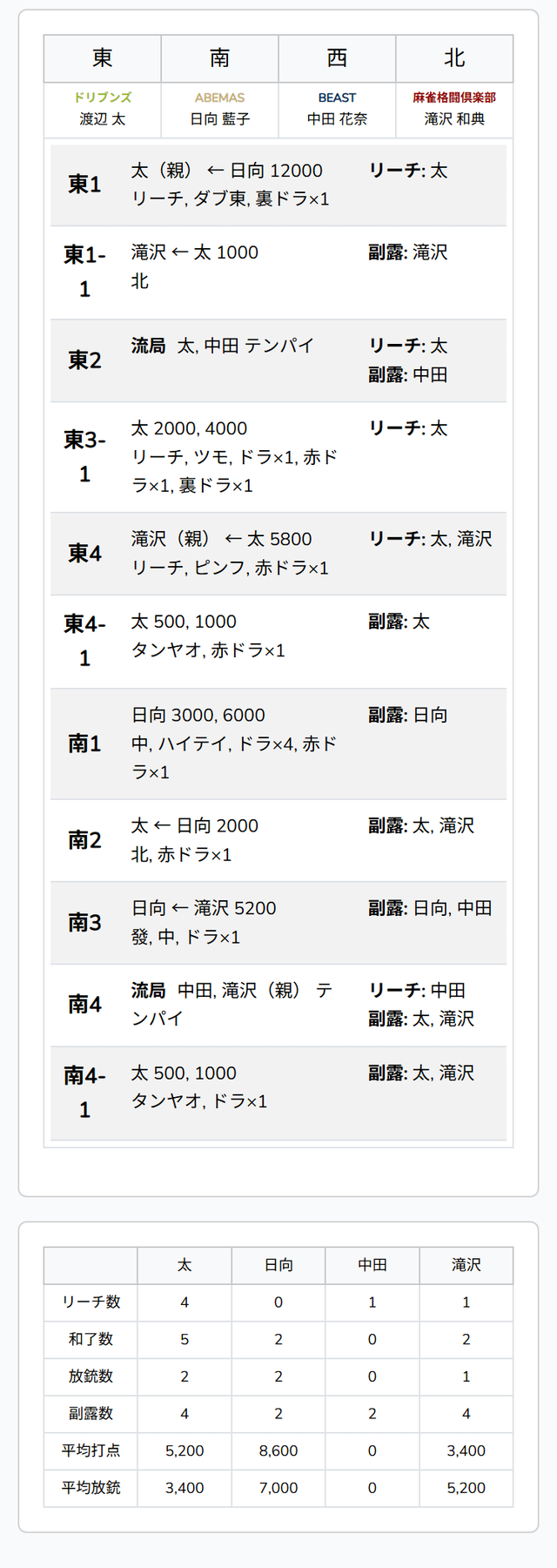 太選手がアガって裏ドラ1枚の12000で一歩リード!
