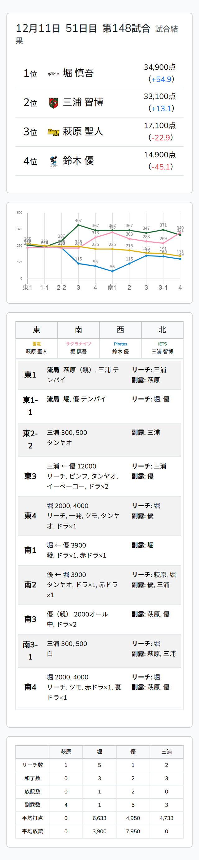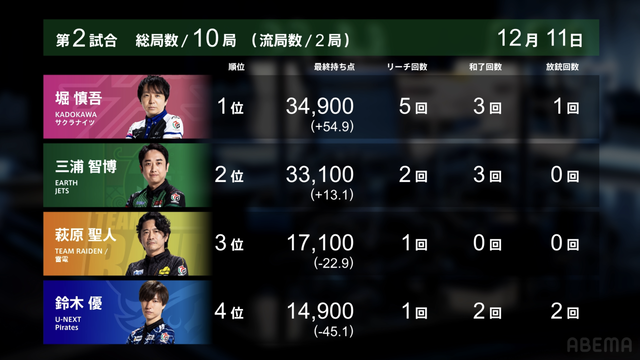 Mリーグ試合速報 12/11 LIVEch 第2試合【萩原・堀・優・三浦】麻雀ウォッチ編集部2025年12月11日Mリーグ速報 第1試合結果記事 【12/11 Mリーグ2025-26 第1試合結果】麻雀chは高打点でリードを広げ、かわし手で逃げ切った渡辺太がトップ!LIVEchは跳満のリードを守り切った黒沢咲が僅差で勝利! 第2試合結果記事 【12/11 Mリーグ2025-26 第2試合結果】麻雀chはバランス良い攻めでアガリを決めた東城りおがトップ!LIVEchはオーラスの裏ドラ条件を実らせた堀慎吾が逆転トップ獲得! 第2試合詳細結果 ©ABEMA 第2試合終了時点のトータルランキング ©ABEMA ▼日程・結果 日程・結果【Mリーグ】-2025-26SEASON ▼選手・チーム成績スタッツ 成績・データ【Mリーグ 2025-26シーズン】 2025年12月11日Mリーグ試合速報 12/11 麻雀ch 第2試合【白鳥・伊達・園田・東城】この記事のライター麻雀ウォッチ編集部麻雀界の最新ニュース、コラム、インタビュー、ランキング、スケジュールなど、麻雀に関するあらゆる情報を発信する日本最大級の麻雀ニュースサイトです。ライターの最新投稿2025年12月11日Mリーグ【12/11 Mリーグ2025-26 第2試合結果】麻雀chはバランス良い攻めでアガリを決めた東城りお...2025年12月11日Mリーグ【12/11 Mリーグ2025-26 第1試合結果】麻雀chは高打点でリードを広げ、かわし手で逃げ切っ...2025年12月11日Mリーグ速報Mリーグ試合速報 12/11 麻雀ch 第2試合【白鳥・伊達・園田・東城】麻雀ウォッチ編集部の記事一覧