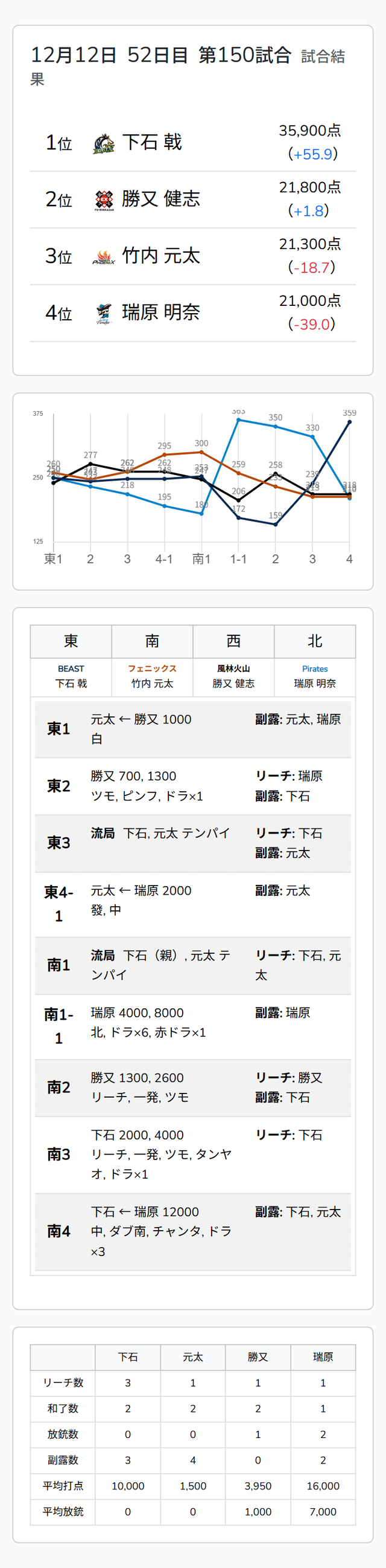 Mリーグ試合速報 12/12 LIVEch 第1試合【下石・元太・勝又・瑞原】麻雀ウォッチ編集部2025年12月12日Mリーグ速報 第1試合結果記事 【12/12 Mリーグ2025-26 第1試合結果】麻雀chは渋川難波が積極的なリーチの姿勢でトップを獲得!LIVEchは下石戟が2局連続の大物手で逆転トップ獲得! 第2試合結果記事 【12/12 Mリーグ2025-26 第2試合結果】麻雀chは伊達朱里紗が嵐のような親番4連続アガリでトップを獲得!LIVEchは下石戟が序盤のリードを固く守り切るトップで同日連勝に成功! 第1試合詳細結果 ©ABEMA 第1試合終了時点のトータルランキング ©ABEMA ▼日程・結果 日程・結果【Mリーグ】-2025-26SEASON ▼選手・チーム成績スタッツ 成績・データ【Mリーグ 2025-26シーズン】 2025年12月11日Mリーグ試合速報 12/11 LIVEch 第2試合【萩原・堀・優・三浦】2025年12月12日Mリーグ試合速報 12/12 麻雀ch 第1試合【柴田・渋川・瀬戸熊・寿人】この記事のライター麻雀ウォッチ編集部麻雀界の最新ニュース、コラム、インタビュー、ランキング、スケジュールなど、麻雀に関するあらゆる情報を発信する日本最大級の麻雀ニュースサイトです。ライターの最新投稿2025年12月12日Mリーグ【12/12 Mリーグ2025-26 第2試合結果】麻雀chは伊達朱里紗が嵐のような親番4連続アガリで...2025年12月12日Mリーグ【12/12 Mリーグ2025-26 第1試合結果】麻雀chは渋川難波が積極的なリーチの姿勢でトップを...2025年12月12日Mリーグ速報Mリーグ試合速報 12/12 麻雀ch 第2試合【本田・三浦・伊達・阿久津】麻雀ウォッチ編集部の記事一覧