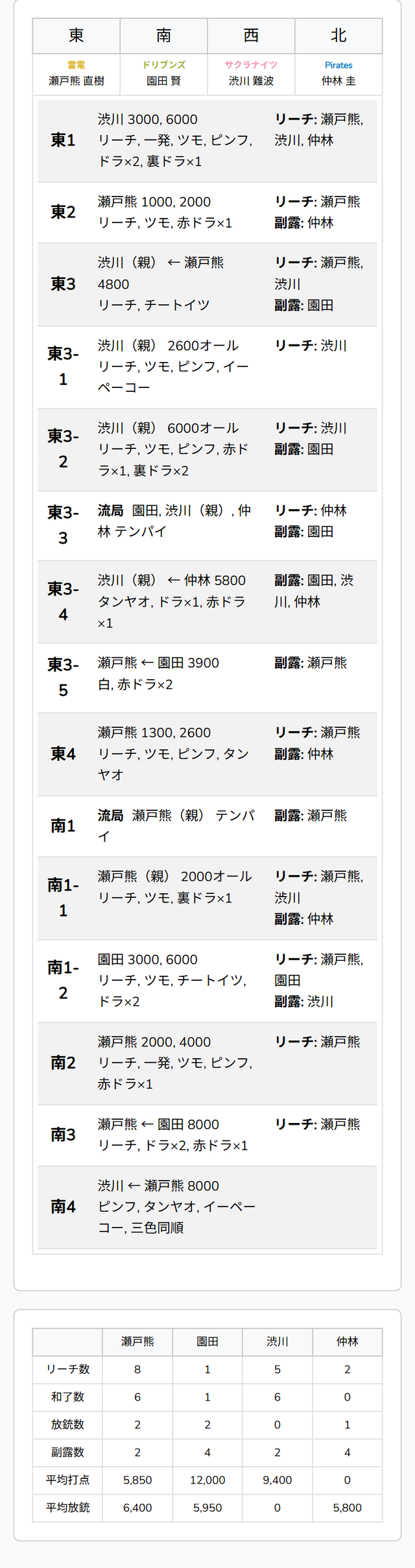 東3局2本場、親の渋川が9巡目に先制リーチ。時間はかかったものの、最終手番でツモアガリ。裏ドラを2枚乗せ、6000は6200オールとした。渋川の持ち点は7万点を超える。