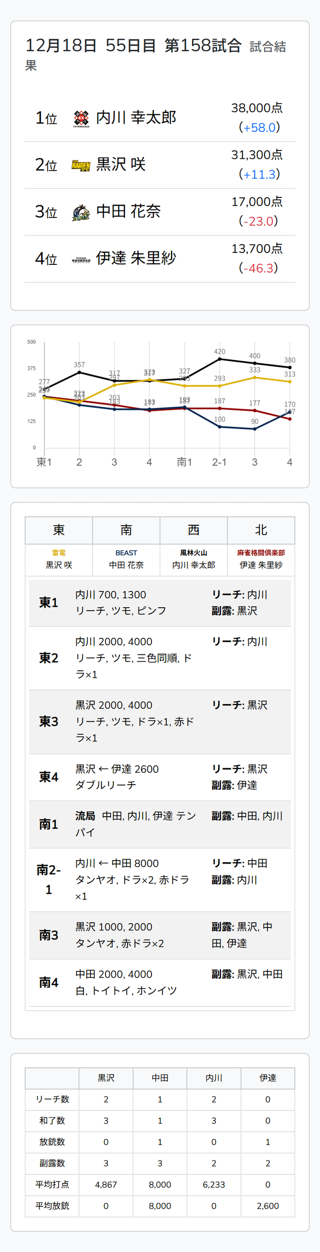 Mリーグ試合速報 12/18 LIVEch 第1試合【黒沢・中田・内川・伊達】麻雀ウォッチ編集部2025年12月18日Mリーグ速報 第1試合結果記事 【12/18 Mリーグ2025-26 第1試合結果】眠れる若獅子、ついに咆える!阿久津翔太のトップでチーム3連勝!LIVEchはデッドヒートを制した内川幸太郎がトップ! 第2試合結果記事 【12/18 Mリーグ2025-26 第2試合結果】禁断の1日2親っ跳ね!茅森早香の大トップでフェニックスのチームポイントはついにプラス域へ!LIVEchは萩原聖人が鋭い三色を決めてトップを手中に収める! 第1試合詳細結果 ©ABEMA 第1試合終了時点のトータルランキング ©ABEMA ▼日程・結果 日程・結果【Mリーグ】-2025-26SEASON ▼選手・チーム成績スタッツ 成績・データ【Mリーグ 2025-26シーズン】 2025年12月18日Mリーグ試合速報 12/18 麻雀ch 第1試合【日向・元太・一馬・阿久津】2025年12月18日Mリーグ試合速報 12/18 麻雀ch 第2試合【堀・逢川・茅森・多井】この記事のライター麻雀ウォッチ編集部麻雀界の最新ニュース、コラム、インタビュー、ランキング、スケジュールなど、麻雀に関するあらゆる情報を発信する日本最大級の麻雀ニュースサイトです。ライターの最新投稿2025年12月18日Mリーグ【12/18 Mリーグ2025-26 第2試合結果】禁断の1日2親っ跳ね!茅森早香の大トップでフェニッ...2025年12月18日Mリーグ【12/18 Mリーグ2025-26 第1試合結果】眠れる若獅子、ついに咆える!阿久津翔太のトップでチ...2025年12月18日Mリーグ速報Mリーグ試合速報 12/18 LIVEch 第2試合【東城・寿人・萩原・内川】麻雀ウォッチ編集部の記事一覧