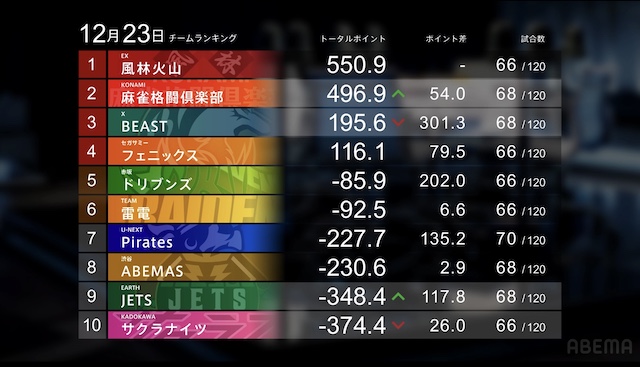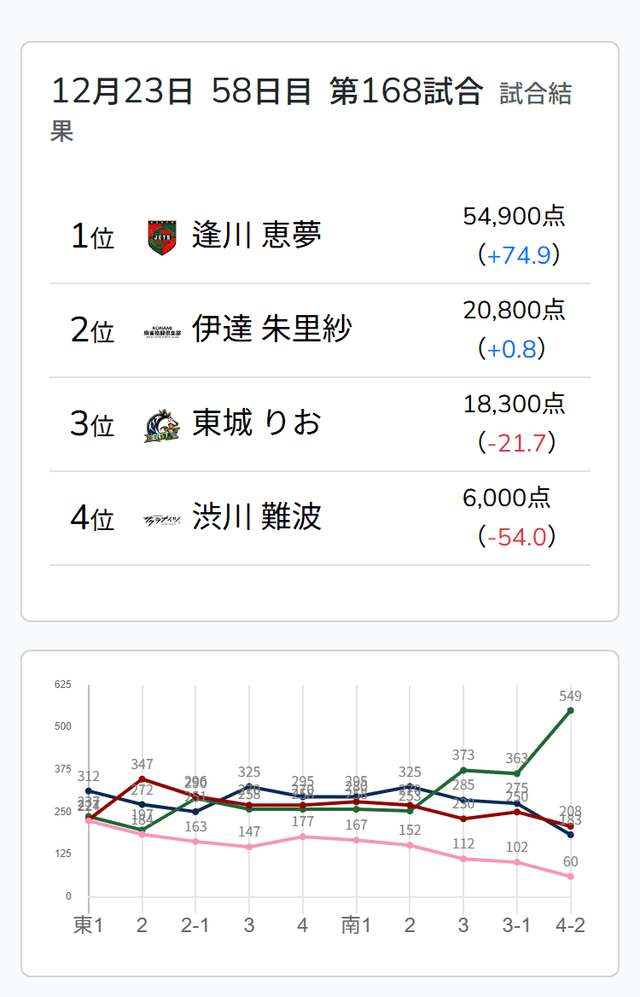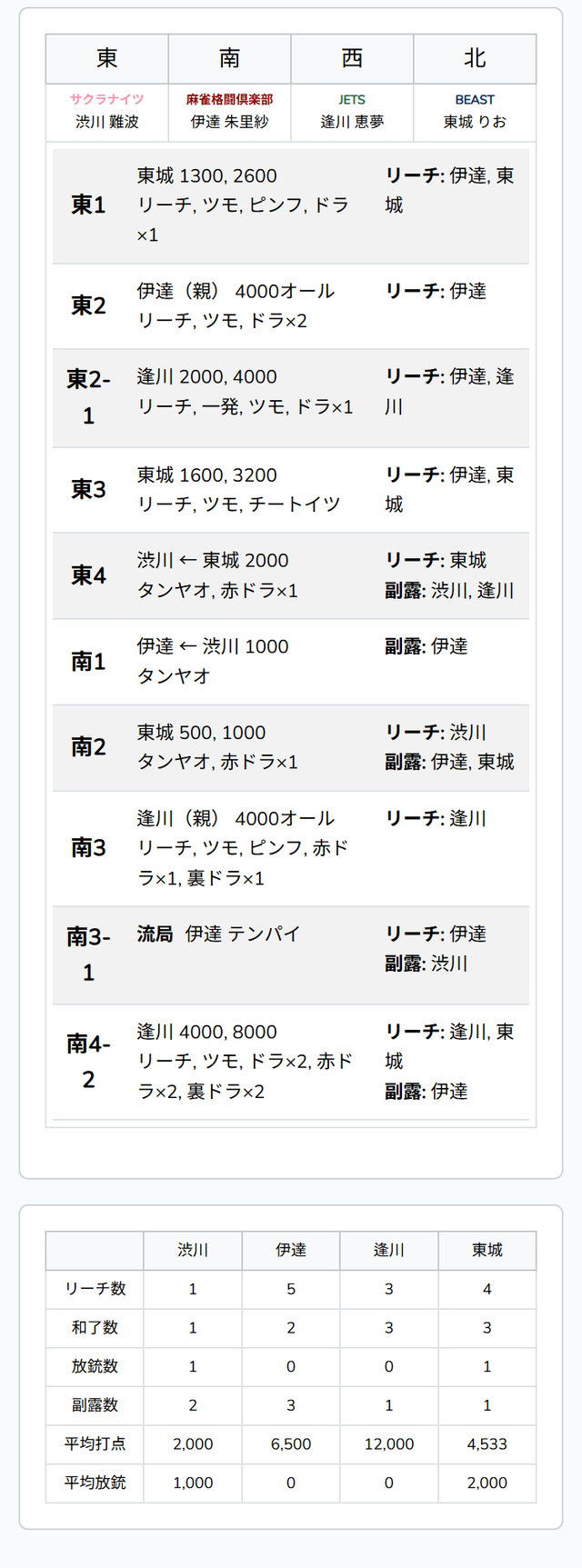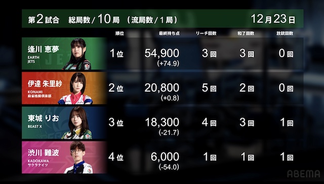待ちの三面張をダマテンに構え、息を潜めた。2人の待ち牌はともに山に3枚ずつ眠っていたが、先にツモアガリしたのは滝沢。裏ドラは乗らなかったものの、テンパネにより2000・4000となった。