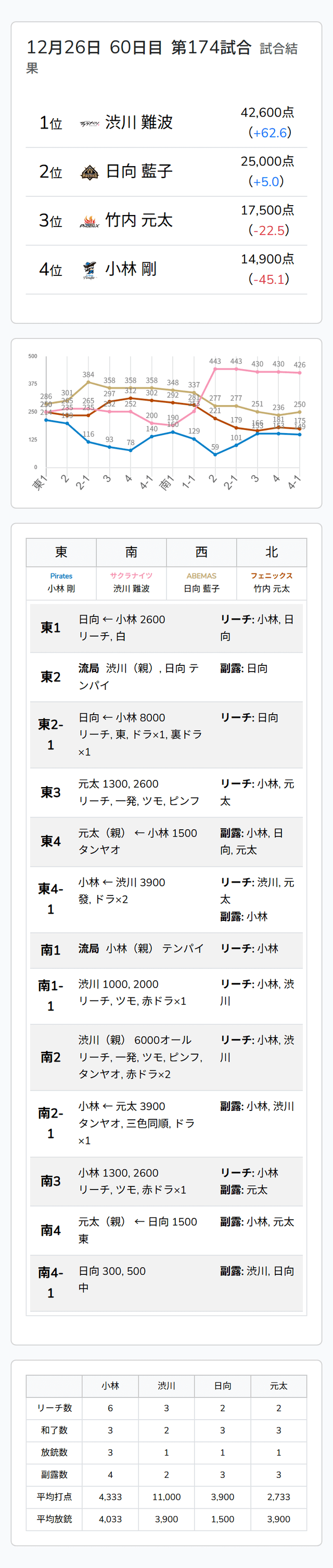 Mリーグ試合速報 12/26 LIVEch 第1試合【小林・渋川・日向・元太】麻雀ウォッチ編集部2025年12月26日Mリーグ速報 第1試合結果記事 【12/26 Mリーグ2025-26 第1試合結果】麻雀chは永井孝典が怒涛の高打点ラッシュで個人10勝目!LIVEchは渋川難波が値千金の6000オールでトップ獲得! 第2試合結果記事 【12/26 Mリーグ2025-26 第2試合結果】麻雀chは鈴木たろうがオーラスの逆転満貫ツモで今季17戦目で初勝利!LIVEchは阿久津翔太がトップでサクラナイツが同日連勝達成! 第1試合詳細結果 ©ABEMA 第1試合終了時点のトータルランキング ©ABEMA ▼日程・結果 日程・結果【Mリーグ】-2025-26SEASON ▼選手・チーム成績スタッツ 成績・データ【Mリーグ 2025-26シーズン】 2025年12月26日Mリーグ試合速報 12/26 麻雀ch 第1試合【永井・瀬戸熊・太・中田】2025年12月26日Mリーグ試合速報 12/26 麻雀ch 第2試合【たろう・下石・萩原・内川】この記事のライター麻雀ウォッチ編集部麻雀界の最新ニュース、コラム、インタビュー、ランキング、スケジュールなど、麻雀に関するあらゆる情報を発信する日本最大級の麻雀ニュースサイトです。ライターの最新投稿2026年1月9日Mリーグ【1/9 Mリーグ2025-26 第2試合結果】麻雀chは高打点の攻防を制した多井隆晴がトップ!LIV...2026年1月9日Mリーグ速報Mリーグ試合速報 1/9 LIVEch 第2試合【優・太・渋川・伊達】2026年1月9日Mリーグ速報Mリーグ試合速報 1/9 麻雀ch 第2試合【瀬戸熊・大介・三浦・多井】麻雀ウォッチ編集部の記事一覧