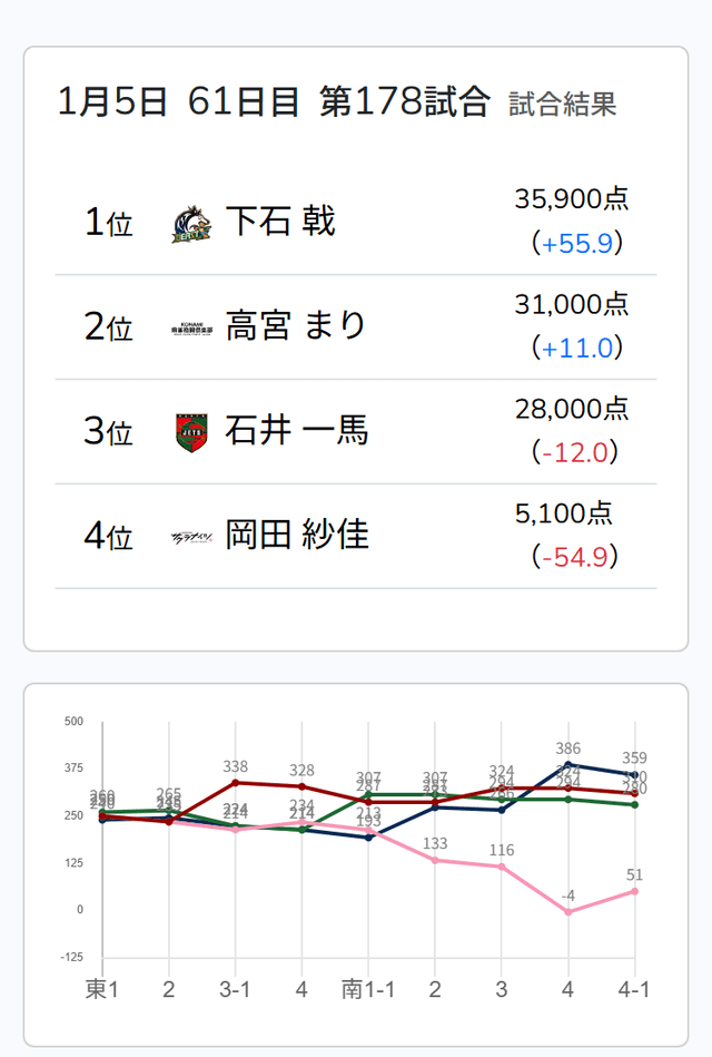 岡田選手から?を捉えて下石選手が12000のアガリでトップ目浮上!