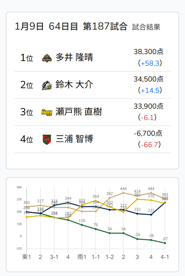 南1局2本場、三浦が高め一気通貫の先制リーチを打つと、同巡多井が三色同順確定の追いかけリーチで対抗。二軒リーチのめくり合いは、多井に軍配が上がる。ツモアガリ。3000・6000は3200・6200で親の瀬戸熊をかわし、トップ目に立った。