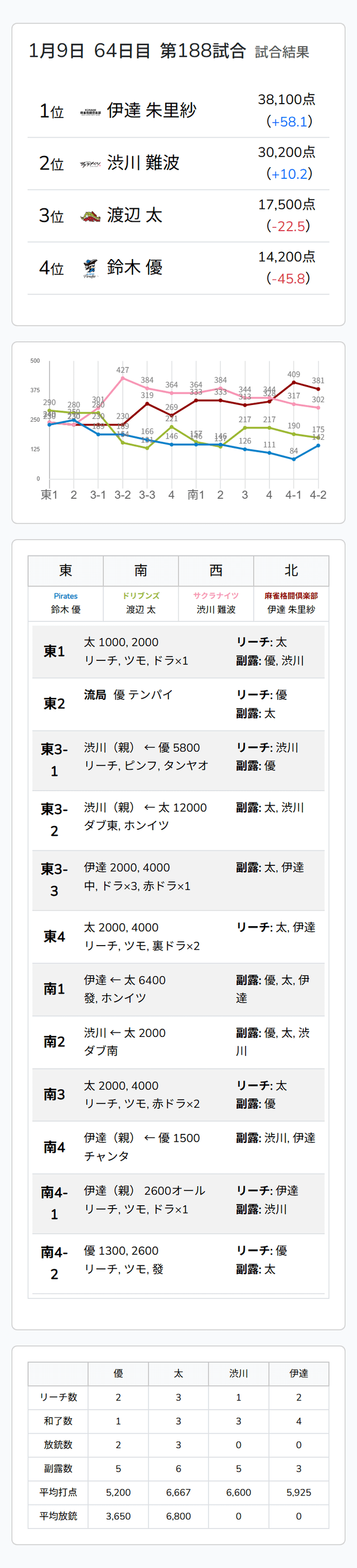 Mリーグ試合速報 1/9 LIVEch 第2試合【優・太・渋川・伊達】麻雀ウォッチ編集部2026年1月9日Mリーグ速報 第1試合結果記事 【1/9 Mリーグ2025-26 第1試合結果】麻雀chは要所の高打点を捉えた下石戟、LIVEchは全員集合の大接戦を制して阿久津翔太がトップ獲得! 第2試合結果記事 【1/9 Mリーグ2025-26 第2試合結果】麻雀chは高打点の攻防を制した多井隆晴がトップ!LIVEchは丁寧な攻守を積み重ねた伊達朱里紗がトップ獲得! 第2試合詳細結果 ©ABEMA 第2試合終了時点のトータルランキング ©ABEMA ▼日程・結果 日程・結果【Mリーグ】-2025-26SEASON ▼選手・チーム成績スタッツ 成績・データ【Mリーグ 2025-26シーズン】 2026年1月9日Mリーグ試合速報 1/9 麻雀ch 第2試合【瀬戸熊・大介・三浦・多井】この記事のライター麻雀ウォッチ編集部麻雀界の最新ニュース、コラム、インタビュー、ランキング、スケジュールなど、麻雀に関するあらゆる情報を発信する日本最大級の麻雀ニュースサイトです。ライターの最新投稿2026年1月9日Mリーグ【1/9 Mリーグ2025-26 第2試合結果】麻雀chは高打点の攻防を制した多井隆晴がトップ!LIV...2026年1月9日Mリーグ速報Mリーグ試合速報 1/9 麻雀ch 第2試合【瀬戸熊・大介・三浦・多井】2026年1月9日Mリーグ速報Mリーグ試合速報 1/9 麻雀ch 第1試合【下石・本田・松本・一馬】麻雀ウォッチ編集部の記事一覧