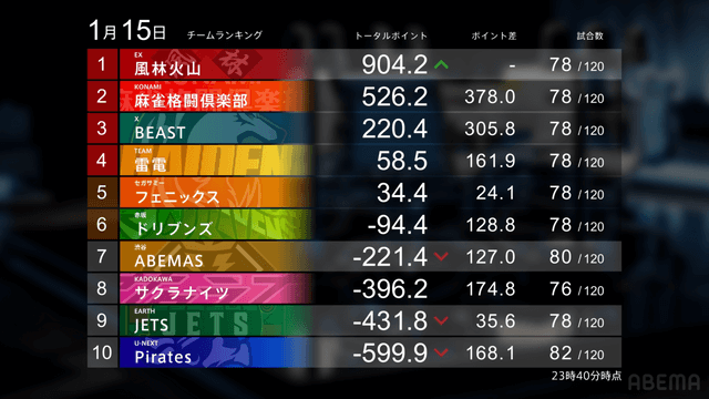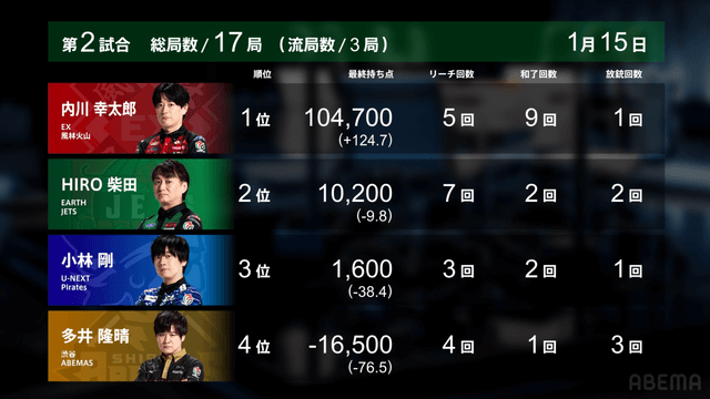 Mリーグ【1/15 Mリーグ2025-26 第2試合結果】麻雀chは2翻のアガリとテンパイ料を積み重ねた連闘の竹内元太が逃げ切りトップ!、麻雀2chは驚異の5局連続親満貫和了を決めた内川幸太郎が歴代最高はならずも10万4700点の今季最高スコアトップを獲得!