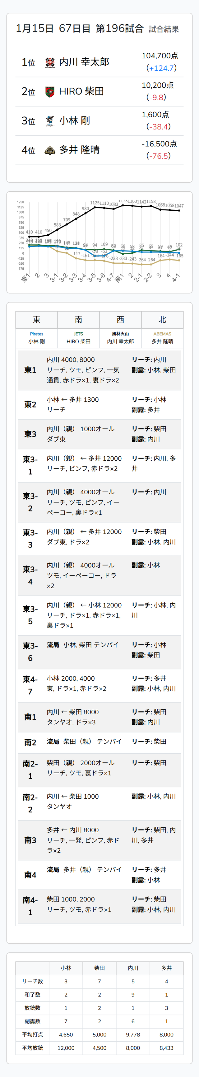 Mリーグ試合速報 1/15 麻雀2ch 第2試合【小林・柴田・内川・多井】麻雀ウォッチ編集部2026年1月15日Mリーグ速報 第1試合結果記事 【1/15 Mリーグ2025-26 第1試合結果】麻雀chは大物手連発の黒沢咲が大トップ、雷電はチーム3連勝!麻雀2chは南場の猛攻で勝負を決めた二階堂亜樹が大トップ! 第2試合結果記事 【1/15 Mリーグ2025-26 第2試合結果】麻雀chは2翻のアガリとテンパイ料を積み重ねた連闘の竹内元太が逃げ切りトップ!、麻雀2chは驚異の5局連続親満貫和了を決めた内川幸太郎が歴代最高はならずも10万4700点の今季最高スコアトップを獲得! 第2試合詳細結果 ©ABEMA 第2試合終了時点のトータルランキング ©ABEMA ▼日程・結果 日程・結果【Mリーグ】-2025-26SEASON ▼選手・チーム成績スタッツ 成績・データ【Mリーグ 2025-26シーズン】 2026年1月15日Mリーグ試合速報 1/15 麻雀ch 第2試合【元太・寿人・たろう・本田】この記事のライター麻雀ウォッチ編集部麻雀界の最新ニュース、コラム、インタビュー、ランキング、スケジュールなど、麻雀に関するあらゆる情報を発信する日本最大級の麻雀ニュースサイトです。ライターの最新投稿2026年1月16日Mリーグ【1/15 Mリーグ2025-26 第2試合結果】麻雀chは2翻のアガリとテンパイ料を積み重ねた連闘の...2026年1月15日Mリーグ【1/15 Mリーグ2025-26 第1試合結果】麻雀chは大物手連発の黒沢咲が大トップ、雷電はチーム...2026年1月15日Mリーグ速報Mリーグ試合速報 1/15 麻雀ch 第2試合【元太・寿人・たろう・本田】麻雀ウォッチ編集部の記事一覧