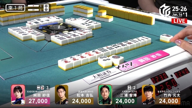 供託1本の東1局1本場、親の岡田が11巡目に先制リーチ。同巡追いついた三浦が追いかけリーチで応戦するが、岡田が一発でツモアガリ。6000オールとなった。