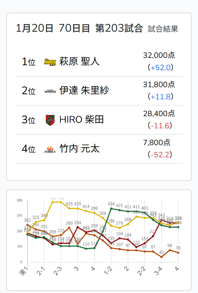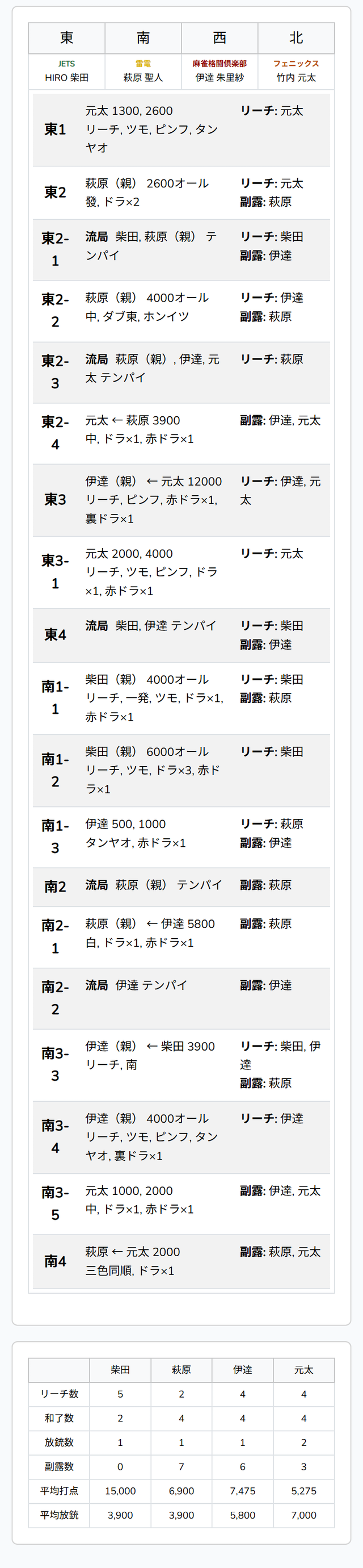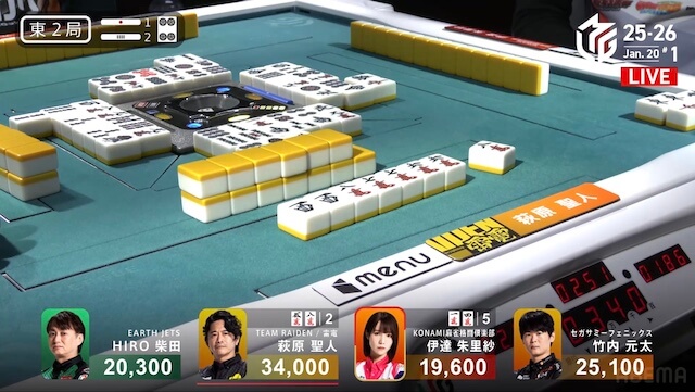東2局2本場、供託が1本ある。伊達が8巡目に先制リーチ。親の萩原が二副露して追いつき、テンパイ。二軒によるめくり合いになった。枚数的には伊達が有利だったものの、萩原がツモアガリ。4000は4200オールとした。