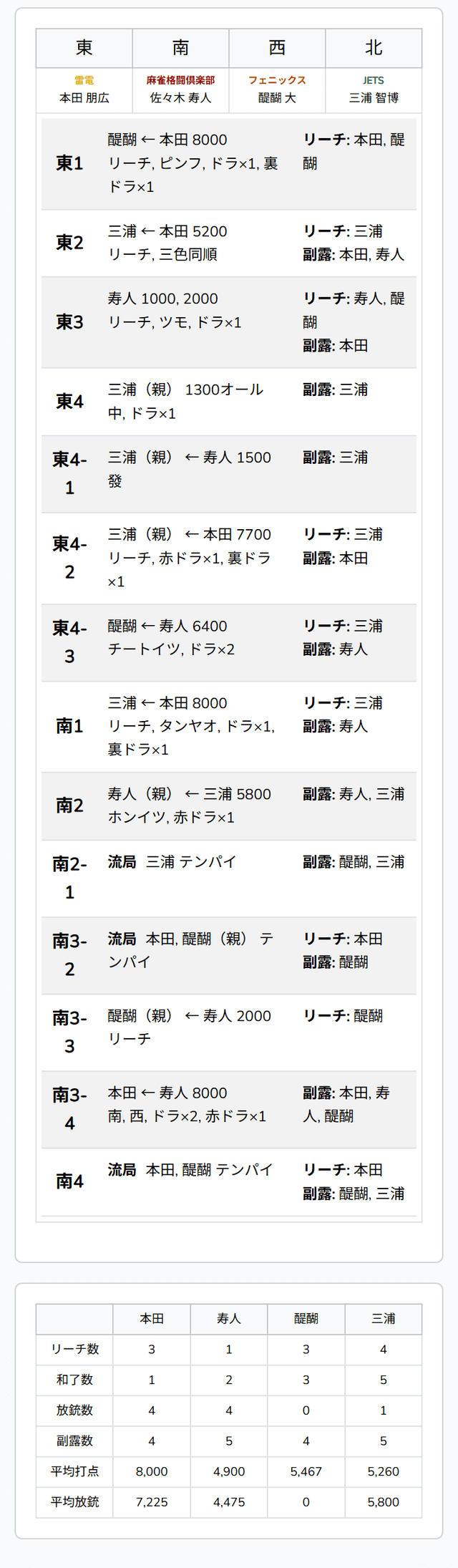 南1局、トップ目の三浦が5巡目に先制リーチ。4着目の本田からロンアガリすると、裏ドラを1枚乗せて、8000を加点した。