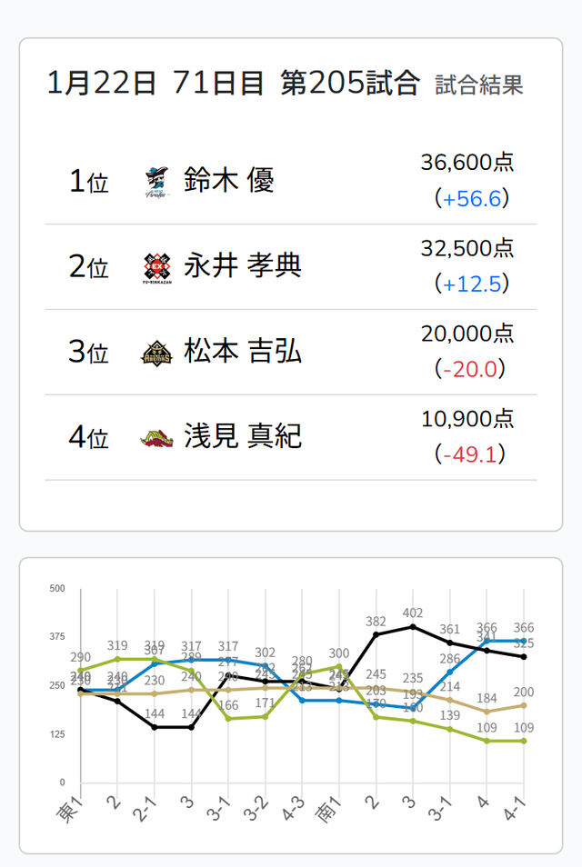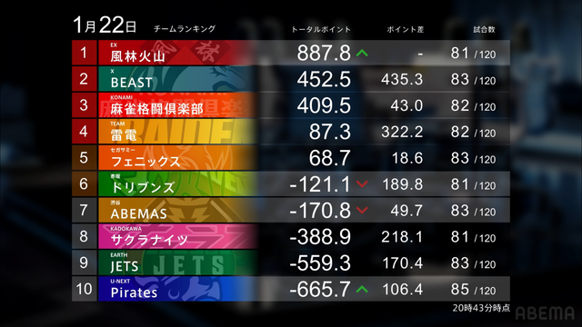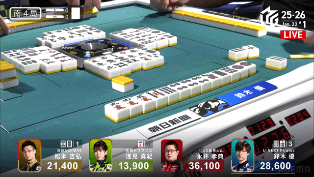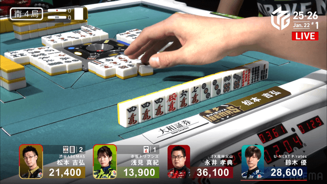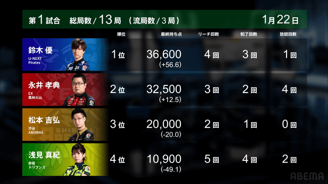 Mリーグ試合速報 1/22 麻雀ch 第1試合【松本・浅見・永井・優】