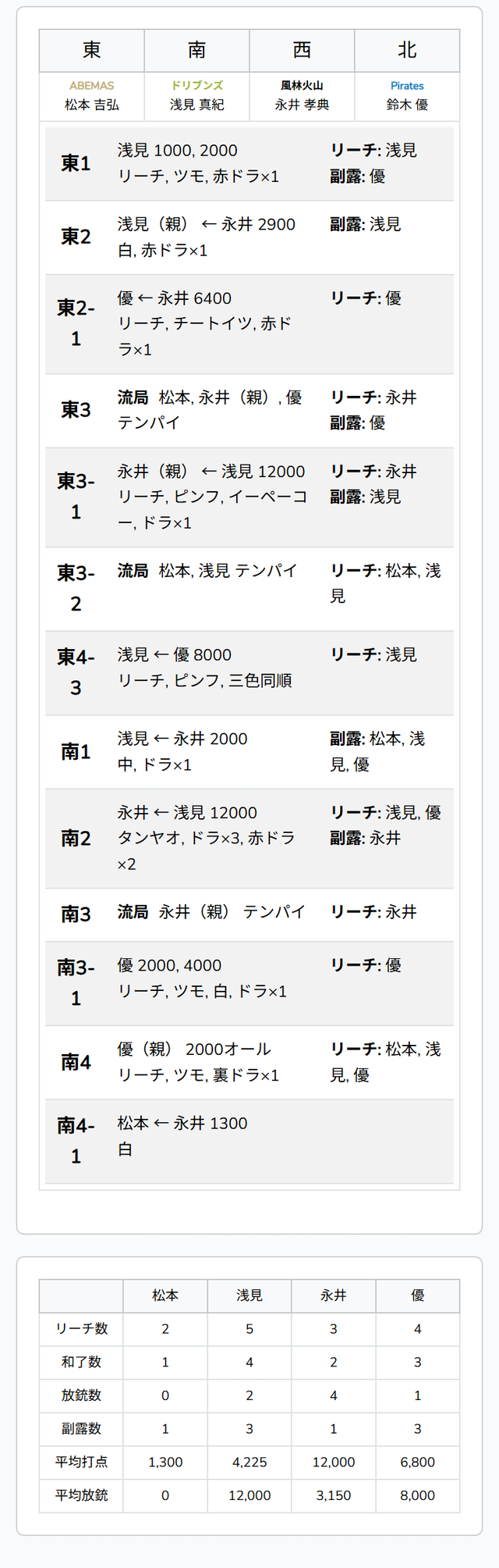 南4局 浅見が345三色同順のカン[四]待ちで先制リーチをかけ、3着目の松本の位置を狙う。ここに松本も出アガリ8000の2着、ツモ裏1の跳満ツモトップを目指す。ここに、浅見の最後のアガリ牌を吸収した親番優が[4][7]待ちで追いかけリーチをかける。あまりに熾烈なめくりあいは、優のツモアガリ、裏ドラ1枚を乗せた2000オールのアガリで微差のトップ目に立って連荘する。