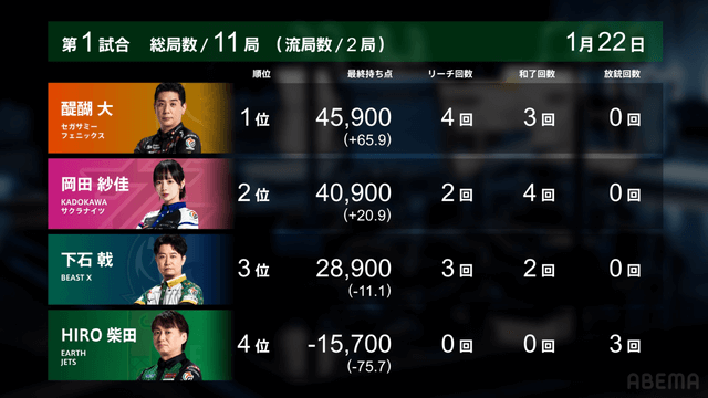 MリーグHIRO柴田 VS 伊達朱里紗 VS 竹内元太 VS 萩原聖人 プラス圏のチームに対して苦しい戦いが続くEARTH JETSが立ち向かう!【Mリーグ2025-26 1/20 レギュラー70日目 第1試合メンバー】