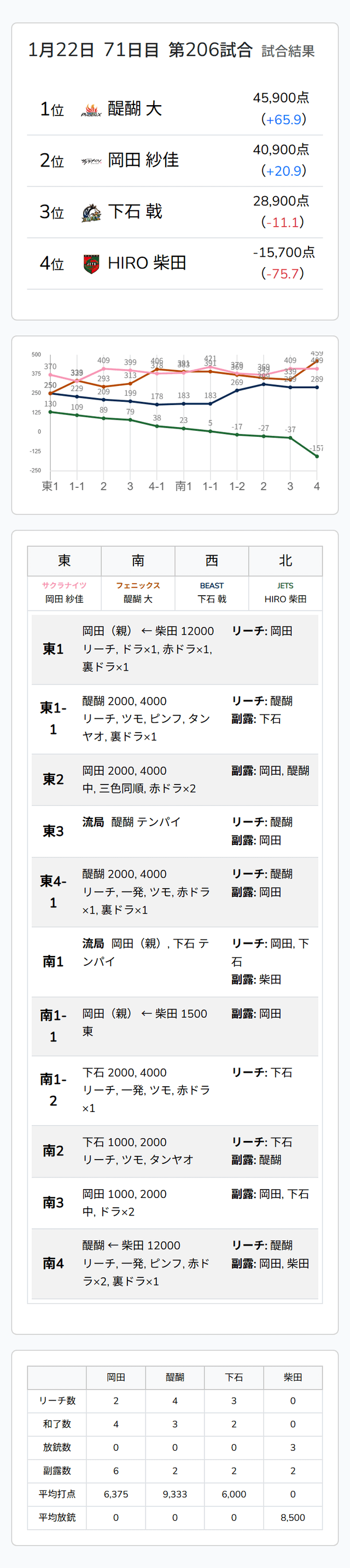 Mリーグ試合速報 1/22 麻雀2ch 第1試合【岡田・醍醐・下石・柴田】麻雀ウォッチ編集部2026年1月22日Mリーグ速報 第1試合結果記事 【1/22 Mリーグ2025-26 第1試合結果】麻雀chは熾烈なオーラスの攻防を制した鈴木優が紙一重のトップ!麻雀2chはトップ争いの攻防を醍醐大が競り勝って逆転トップ! 第2試合結果記事 【1/22 Mリーグ2025-26 第2試合結果】麻雀chは巧みな選択が光った白鳥翔が激戦を制してトップ!麻雀2chは東場の猛攻で石井一馬が逃げ切りトップ! 第1試合詳細結果 ©ABEMA 第1試合終了時点のトータルランキング ©ABEMA ▼日程・結果 日程・結果【Mリーグ】-2025-26SEASON ▼選手・チーム成績スタッツ 成績・データ【Mリーグ 2025-26シーズン】 2026年1月20日Mリーグ試合速報 1/20 第2試合【本田・寿人・醍醐・三浦】2026年1月22日Mリーグ試合速報 1/22 麻雀ch 第1試合【松本・浅見・永井・優】この記事のライター麻雀ウォッチ編集部麻雀界の最新ニュース、コラム、インタビュー、ランキング、スケジュールなど、麻雀に関するあらゆる情報を発信する日本最大級の麻雀ニュースサイトです。ライターの最新投稿2026年1月22日Mリーグ【1/22 Mリーグ2025-26 第2試合結果】麻雀chは巧みな選択が光った白鳥翔が激戦を制してトッ...2026年1月22日Mリーグ【1/22 Mリーグ2025-26 第1試合結果】麻雀chは熾烈なオーラスの攻防を制した鈴木優が紙一重...2026年1月22日Mリーグ速報Mリーグ試合速報 1/22 麻雀2ch 第2試合【大介・一馬・阿久津・茅森】麻雀ウォッチ編集部の記事一覧