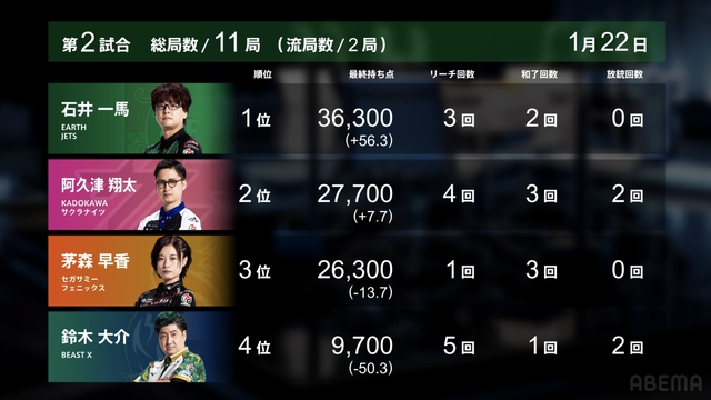 Mリーグ試合速報 1/22 麻雀2ch 第2試合【大介・一馬・阿久津・茅森】麻雀ウォッチ編集部2026年1月22日Mリーグ速報 第1試合結果記事 【1/22 Mリーグ2025-26 第1試合結果】麻雀chは熾烈なオーラスの攻防を制した鈴木優が紙一重のトップ!麻雀2chはトップ争いの攻防を醍醐大が競り勝って逆転トップ! 第2試合結果記事 【1/22 Mリーグ2025-26 第2試合結果】麻雀chは巧みな選択が光った白鳥翔が激戦を制してトップ!麻雀2chは東場の猛攻で石井一馬が逃げ切りトップ! 第2試合詳細結果 ©ABEMA 第2試合終了時点のトータルランキング ©ABEMA ▼日程・結果 日程・結果【Mリーグ】-2025-26SEASON ▼選手・チーム成績スタッツ 成績・データ【Mリーグ 2025-26シーズン】 2026年1月22日Mリーグ試合速報 1/22 麻雀ch 第2試合【小林・勝又・園田・白鳥】この記事のライター麻雀ウォッチ編集部麻雀界の最新ニュース、コラム、インタビュー、ランキング、スケジュールなど、麻雀に関するあらゆる情報を発信する日本最大級の麻雀ニュースサイトです。ライターの最新投稿2026年1月22日Mリーグ【1/22 Mリーグ2025-26 第2試合結果】麻雀chは巧みな選択が光った白鳥翔が激戦を制してトッ...2026年1月22日Mリーグ【1/22 Mリーグ2025-26 第1試合結果】麻雀chは熾烈なオーラスの攻防を制した鈴木優が紙一重...2026年1月22日Mリーグ速報Mリーグ試合速報 1/22 麻雀ch 第2試合【小林・勝又・園田・白鳥】麻雀ウォッチ編集部の記事一覧