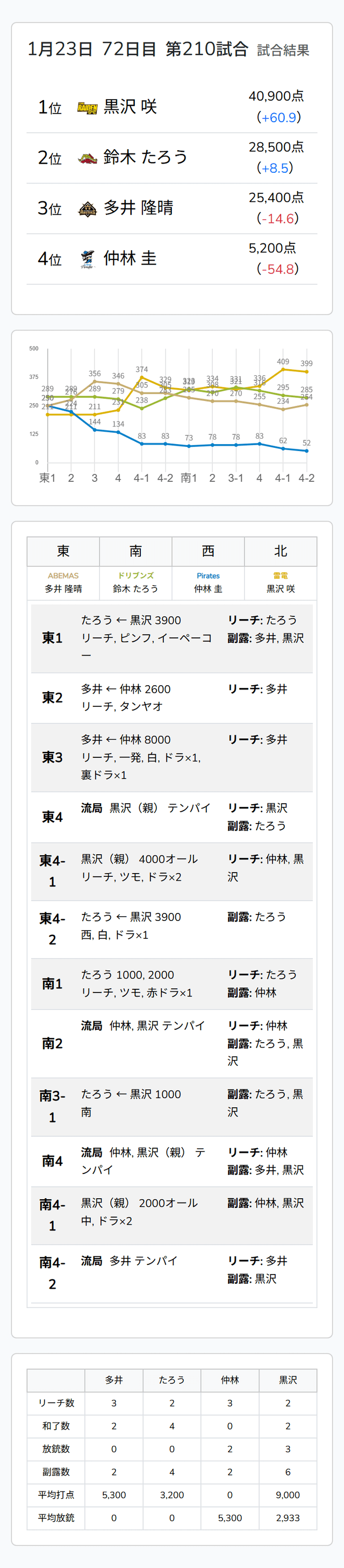 Mリーグ試合速報 1/23 麻雀2ch 第1試合【多井・たろう・仲林・黒沢】麻雀ウォッチ編集部2026年1月23日Mリーグ速報 第1試合結果記事 【1/23 Mリーグ2025-26 第1試合結果】麻雀chは鋭い攻勢を重ねた永井孝典が個人12勝目!麻雀2chは的確な加点を重ねた黒沢咲がトップ獲得! 第2試合結果記事 【1/23 Mリーグ2025-26 第2試合結果】麻雀chは着実にアガリを重ねた堀慎吾、麻雀2chは驚異のチンイツ三倍満を決めた渡辺太がトップ獲得! 第1試合詳細結果 ©ABEMA 第1試合終了時点のトータルランキング ©ABEMA ▼日程・結果 日程・結果【Mリーグ】-2025-26SEASON ▼選手・チーム成績スタッツ 成績・データ【Mリーグ 2025-26シーズン】 2026年1月23日Mリーグ試合速報 1/23 麻雀ch 第1試合【渋川・永井・滝沢・東城】2026年1月23日Mリーグ試合速報 1/23 麻雀2ch 第2試合【瀬戸熊・多井・太・優】この記事のライター麻雀ウォッチ編集部麻雀界の最新ニュース、コラム、インタビュー、ランキング、スケジュールなど、麻雀に関するあらゆる情報を発信する日本最大級の麻雀ニュースサイトです。ライターの最新投稿2026年1月23日Mリーグ【1/23 Mリーグ2025-26 第2試合結果】麻雀chは着実にアガリを重ねた堀慎吾、麻雀2chは驚...2026年1月23日Mリーグ【1/23 Mリーグ2025-26 第1試合結果】麻雀chは鋭い攻勢を重ねた永井孝典が個人12勝目!麻...2026年1月23日Mリーグ速報Mリーグ試合速報 1/23 麻雀ch 第2試合【中田・高宮・堀・勝又】麻雀ウォッチ編集部の記事一覧