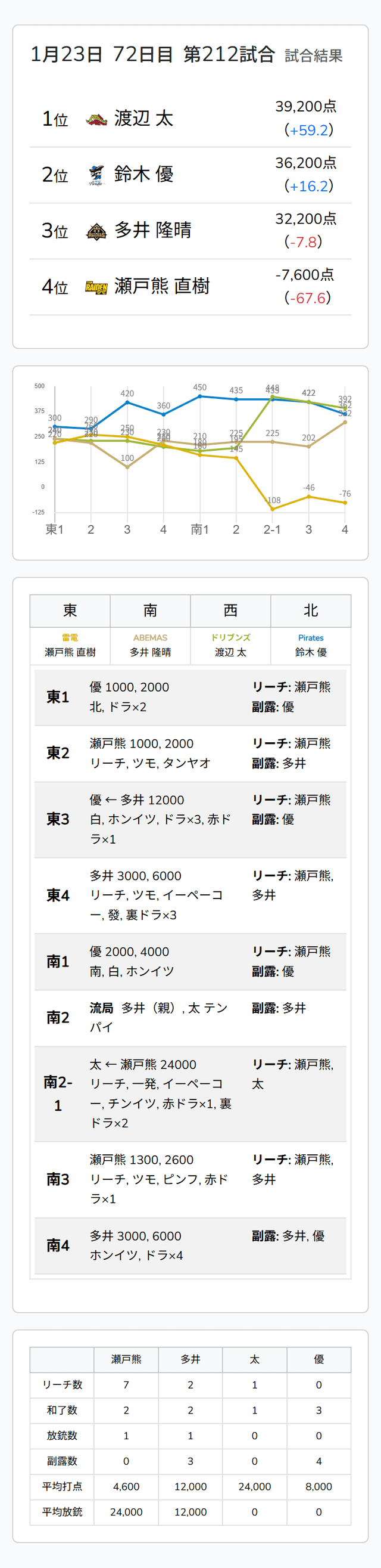 Mリーグ試合速報 1/23 麻雀2ch 第2試合【瀬戸熊・多井・太・優】麻雀ウォッチ編集部2026年1月23日Mリーグ速報 第1試合結果記事 【1/23 Mリーグ2025-26 第1試合結果】麻雀chは鋭い攻勢を重ねた永井孝典が個人12勝目!麻雀2chは的確な加点を重ねた黒沢咲がトップ獲得! 第2試合結果記事 【1/23 Mリーグ2025-26 第2試合結果】麻雀chは着実にアガリを重ねた堀慎吾、麻雀2chは驚異のチンイツ三倍満を決めた渡辺太がトップ獲得! 第2試合詳細結果 ©ABEMA 第2試合終了時点のトータルランキング ©ABEMA ▼日程・結果 日程・結果【Mリーグ】-2025-26SEASON ▼選手・チーム成績スタッツ 成績・データ【Mリーグ 2025-26シーズン】 2026年1月23日Mリーグ試合速報 1/23 麻雀2ch 第1試合【多井・たろう・仲林・黒沢】2026年1月23日Mリーグ試合速報 1/23 麻雀ch 第2試合【中田・高宮・堀・勝又】この記事のライター麻雀ウォッチ編集部麻雀界の最新ニュース、コラム、インタビュー、ランキング、スケジュールなど、麻雀に関するあらゆる情報を発信する日本最大級の麻雀ニュースサイトです。ライターの最新投稿2026年1月23日Mリーグ【1/23 Mリーグ2025-26 第2試合結果】麻雀chは着実にアガリを重ねた堀慎吾、麻雀2chは驚...2026年1月23日Mリーグ【1/23 Mリーグ2025-26 第1試合結果】麻雀chは鋭い攻勢を重ねた永井孝典が個人12勝目!麻...2026年1月23日Mリーグ速報Mリーグ試合速報 1/23 麻雀ch 第2試合【中田・高宮・堀・勝又】麻雀ウォッチ編集部の記事一覧