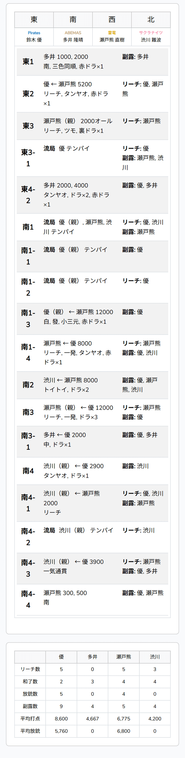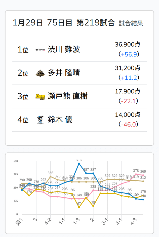 Mリーグ試合速報 1/29 麻雀ch 第2試合【優・多井・瀬戸熊・渋川】