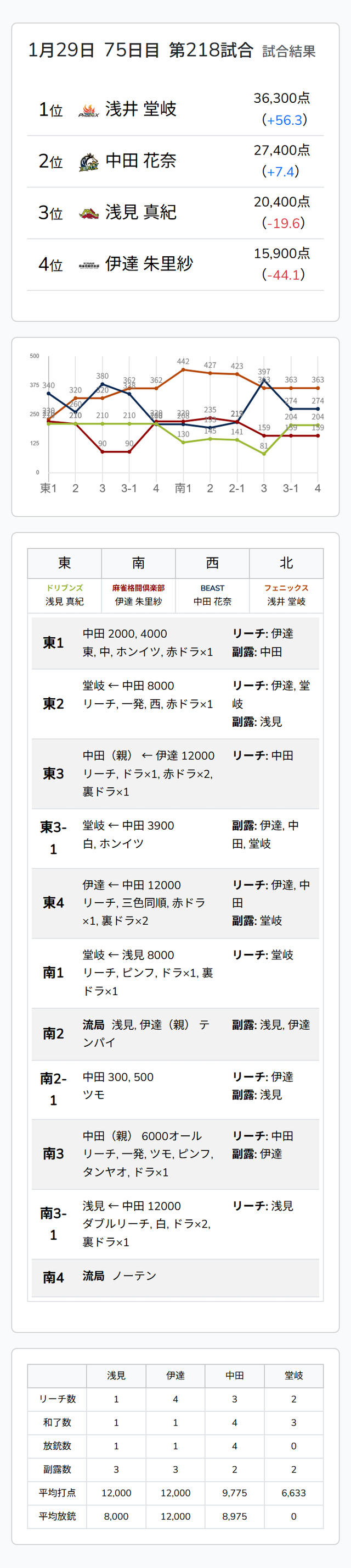 Mリーグ試合速報 1/29 麻雀2ch 第1試合【浅見・伊達・中田・堂岐】麻雀ウォッチ編集部2026年1月29日Mリーグ速報 第1試合結果記事 【1/29 Mリーグ2025-26 第1試合結果】麻雀chは稀にみる大激戦を本田朋広が粘り勝ちでトップを掴みとる!麻雀2chは高打点乱れ飛ぶ試合となるも復帰登板の浅井堂岐がトップ獲得! 第2試合結果記事 【1/29 Mリーグ2025-26 第2試合結果】麻雀chはオーラスの連荘で逆転した渋川難波がトップ!麻雀2chは劇的な海底一発ツモの醍醐大がトップでチーム同日連勝! 第1試合詳細結果 ©ABEMA 第1試合終了時点のトータルランキング ©ABEMA ▼日程・結果 日程・結果【Mリーグ】-2025-26SEASON ▼選手・チーム成績スタッツ 成績・データ【Mリーグ 2025-26シーズン】 2026年1月29日Mリーグ試合速報 1/29 麻雀ch 第1試合【岡田・瑞原・松本・本田】2026年1月29日Mリーグ試合速報 1/29 麻雀2ch 第2試合【醍醐・園田・高宮・大介】この記事のライター麻雀ウォッチ編集部麻雀界の最新ニュース、コラム、インタビュー、ランキング、スケジュールなど、麻雀に関するあらゆる情報を発信する日本最大級の麻雀ニュースサイトです。ライターの最新投稿2026年1月30日Mリーグ【1/29 Mリーグ2025-26 第2試合結果】麻雀chはオーラスの連荘で逆転した渋川難波がトップ!...2026年1月29日Mリーグ【1/29 Mリーグ2025-26 第1試合結果】麻雀chは稀にみる大激戦を本田朋広が粘り勝ちでトップ...2026年1月29日Mリーグ速報Mリーグ試合速報 1/29 麻雀ch 第2試合【優・多井・瀬戸熊・渋川】麻雀ウォッチ編集部の記事一覧