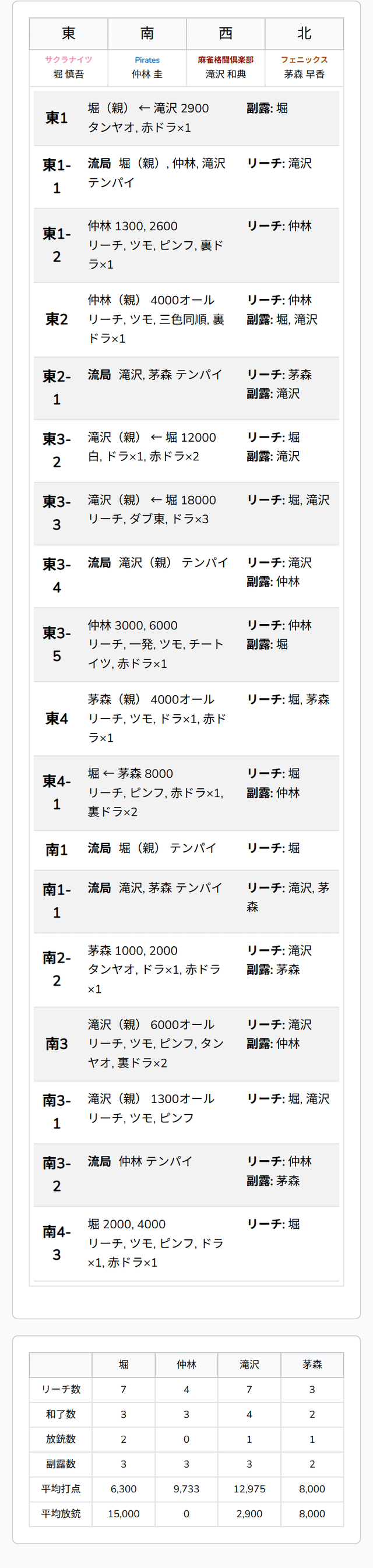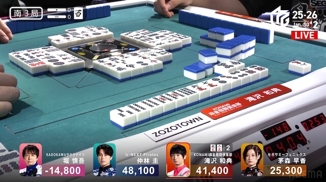 南3局、2着目で親の滝沢が5巡目に先制リーチ。滝沢は終盤にツモアガリすると、裏ドラを2枚乗せて6000オールとし、トップ目に立った。