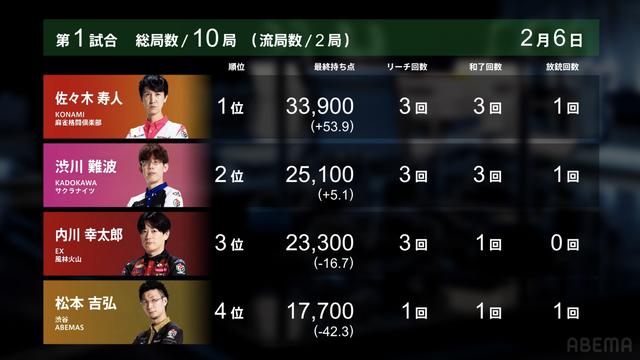 Mリーグ【2/6 Mリーグ2025-26 第2試合結果】麻雀chは的確なアガリを決めた瀬戸熊直樹がトップ獲得、麻雀2chは6000オールを決めた滝沢和典がトップ獲得!堀慎吾はMリーグ初の小四喜を決めるも2着まで!