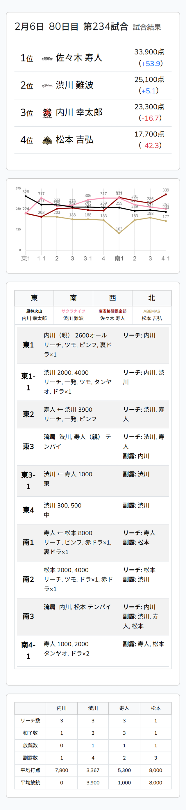 Mリーグ試合速報 2/6 麻雀2ch 第1試合【内川・渋川・寿人・松本】麻雀ウォッチ編集部2026年2月6日Mリーグ速報 第1試合結果記事 【2/6 Mリーグ2025-26 第1試合結果】麻雀chは鋭い親跳満を決めた黒沢咲、麻雀2chは大接戦のオーラスを制した佐々木寿人がトップ獲得! 第2試合結果記事 【2/6 Mリーグ2025-26 第2試合結果】麻雀chは的確なアガリを決めた瀬戸熊直樹がトップ獲得、麻雀2chは6000オールを決めた滝沢和典がトップ獲得!堀慎吾はMリーグ初の小四喜を決めるも2着まで! 第1試合詳細結果 ©ABEMA 第1試合終了時点のトータルランキング ©ABEMA ▼日程・結果 日程・結果【Mリーグ】-2025-26SEASON ▼選手・チーム成績スタッツ 成績・データ【Mリーグ 2025-26シーズン】 2026年2月5日Mリーグ試合速報 2/5 麻雀ch 第2試合【園田・仲林・堂岐・勝又】2026年2月6日Mリーグ試合速報 2/6 麻雀ch 第1試合【東城・柴田・醍醐・黒沢】この記事のライター麻雀ウォッチ編集部麻雀界の最新ニュース、コラム、インタビュー、ランキング、スケジュールなど、麻雀に関するあらゆる情報を発信する日本最大級の麻雀ニュースサイトです。ライターの最新投稿2026年2月6日Mリーグ【2/6 Mリーグ2025-26 第2試合結果】麻雀chは的確なアガリを決めた瀬戸熊直樹がトップ獲得、...2026年2月6日Mリーグ【2/6 Mリーグ2025-26 第1試合結果】麻雀chは鋭い親跳満を決めた黒沢咲、麻雀2chは大接戦...2026年2月6日Mリーグ速報Mリーグ試合速報 2/6 麻雀ch 第2試合【瀬戸熊・中田・逢川・茅森】麻雀ウォッチ編集部の記事一覧
