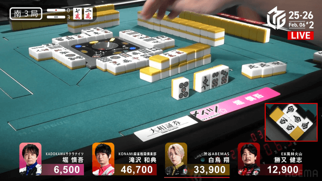 ポンと三副露し、小四喜をテンパイする中、勝又が
