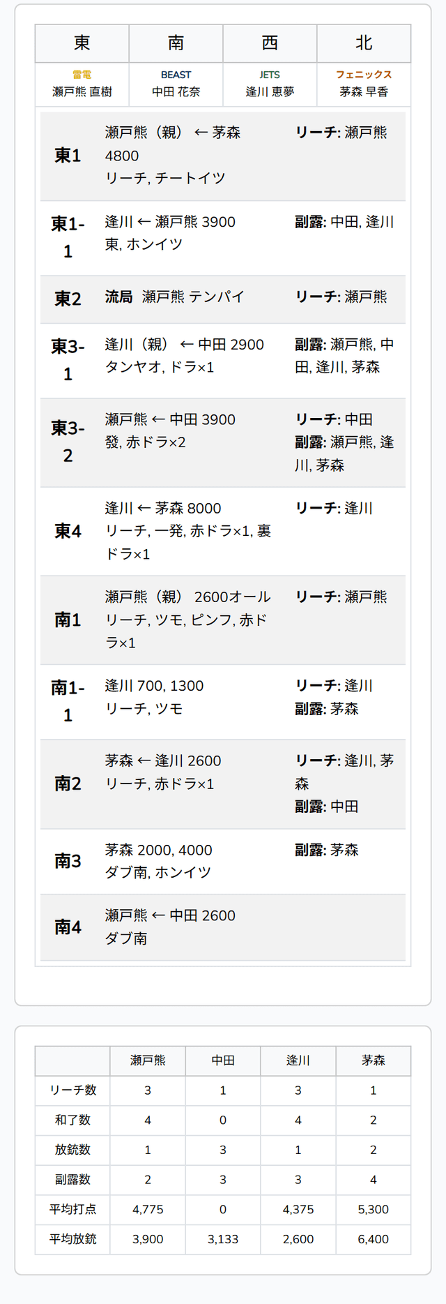 南1局、2着目で親の瀬戸熊が先制リーチ。ツモアガリで2600オールを手にし、トップ目に立つ。