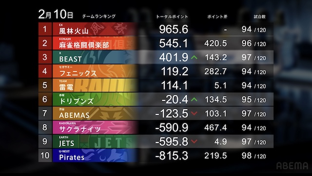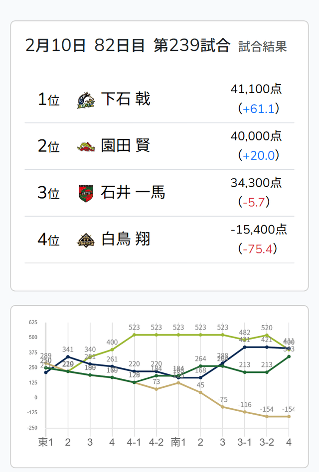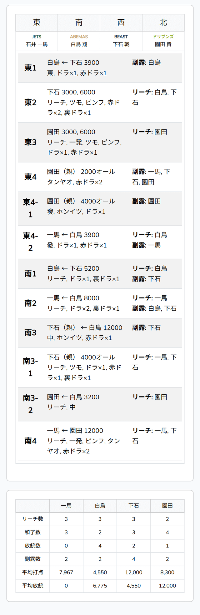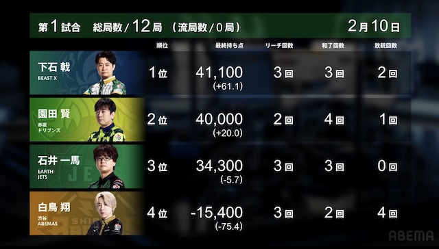 を一発で抜き打つ。一馬がロンアガリすると、12000となり、園田がトップから陥落。下石が逆転トップで試合終了となった。