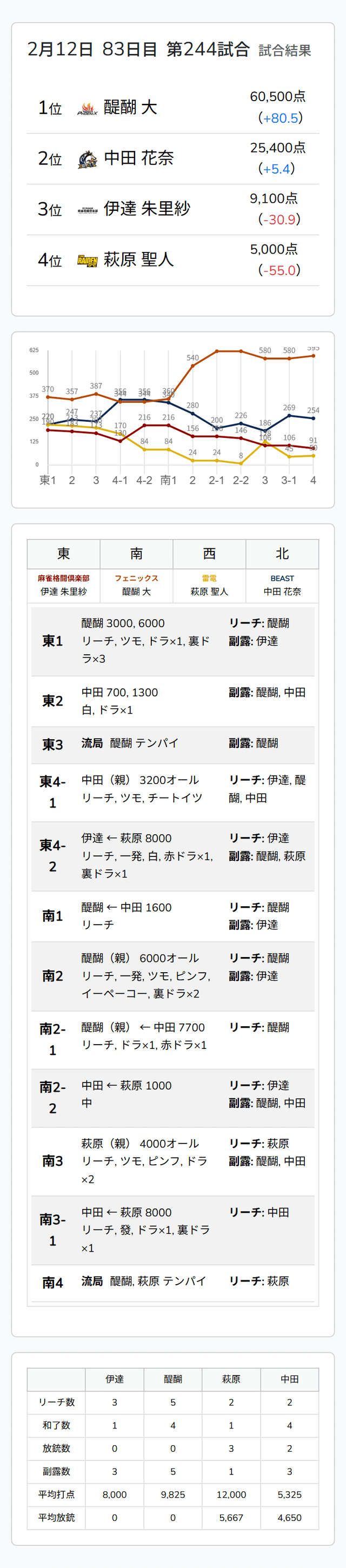 Mリーグ試合速報 2/12 麻雀2ch 第2試合【伊達・醍醐・萩原・中田】麻雀ウォッチ編集部2026年2月12日Mリーグ速報 第1試合結果記事 【2/12 Mリーグ2025-26 第1試合結果】麻雀chは東場の連続満貫で大きなリードを築いた瑞原明奈が大トップ!麻雀2chは大物手を独占した佐々木寿人が大トップ! 第2試合結果記事 【2/12 Mリーグ2025-26 第2試合結果】麻雀chはマンズのホンイツで大きく加点した日向藍子がトップ!麻雀2chは醍醐大が裏ドラも味方につけて大トップ! 第2試合詳細結果 ©ABEMA 第2試合終了時点のトータルランキング ©ABEMA ▼日程・結果 日程・結果【Mリーグ】-2025-26SEASON ▼選手・チーム成績スタッツ 成績・データ【Mリーグ 2025-26シーズン】 2026年2月12日Mリーグ試合速報 2/12 麻雀ch 第1試合【松本・永井・阿久津・瑞原】2026年2月12日Mリーグ試合速報 2/12 麻雀ch 第2試合【渋川・仲林・亜樹・日向】この記事のライター麻雀ウォッチ編集部麻雀界の最新ニュース、コラム、インタビュー、ランキング、スケジュールなど、麻雀に関するあらゆる情報を発信する日本最大級の麻雀ニュースサイトです。ライターの最新投稿2026年3月5日Mリーグ【3/5 Mリーグ2025-26 第2試合結果】トップは内川幸太郎との連闘対決を制した下石戟!終始苦し...2026年3月5日Mリーグ【3/5 Mリーグ2025-26 第1試合結果】トップは三つ巴のオーラスを制した内川幸太郎!浅見真紀は...2026年3月5日Mリーグ速報Mリーグ試合速報 3/5 第2試合【醍醐・内川・たろう・下石】麻雀ウォッチ編集部の記事一覧