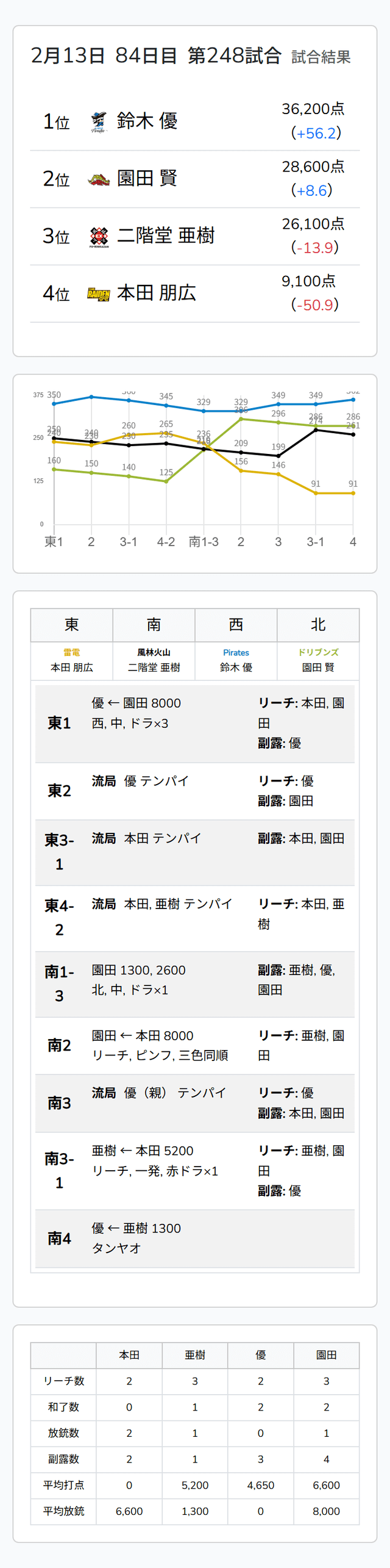 Mリーグ試合速報 2/13 麻雀2ch 第2試合【本田・亜樹・優・園田】麻雀ウォッチ編集部2026年2月13日Mリーグ速報 第1試合結果記事 【2/13 Mリーグ2025-26 第1試合結果】麻雀chはオーラスの跳満直撃で滝沢和典が逆転トップ!麻雀2chは黒沢咲が値千金の逆転満貫ツモでトップ奪取! 第2試合結果記事 【2/13 Mリーグ2025-26 第2試合結果】麻雀chは倍満ツモで大きくリードした渋川難波がトップ獲得!麻雀2chは東1局のリードを守った鈴木優がトップ獲得! 第2試合詳細結果 ©ABEMA 第2試合終了時点のトータルランキング ©ABEMA ▼日程・結果 日程・結果【Mリーグ】-2025-26SEASON ▼選手・チーム成績スタッツ 成績・データ【Mリーグ 2025-26シーズン】 2026年2月13日Mリーグ試合速報 2/13 麻雀ch 第1試合【滝沢・醍醐・逢川・堀】2026年2月13日Mリーグ試合速報 2/13 麻雀ch 第2試合【茅森・渋川・寿人・一馬】この記事のライター麻雀ウォッチ編集部麻雀界の最新ニュース、コラム、インタビュー、ランキング、スケジュールなど、麻雀に関するあらゆる情報を発信する日本最大級の麻雀ニュースサイトです。ライターの最新投稿2026年2月13日Mリーグ【2/13 Mリーグ2025-26 第2試合結果】麻雀chは倍満ツモで大きくリードした渋川難波がトップ...2026年2月13日Mリーグ【2/13 Mリーグ2025-26 第1試合結果】麻雀chはオーラスの跳満直撃で滝沢和典が逆転トップ!...2026年2月13日Mリーグ速報Mリーグ試合速報 2/13 麻雀ch 第2試合【茅森・渋川・寿人・一馬】麻雀ウォッチ編集部の記事一覧