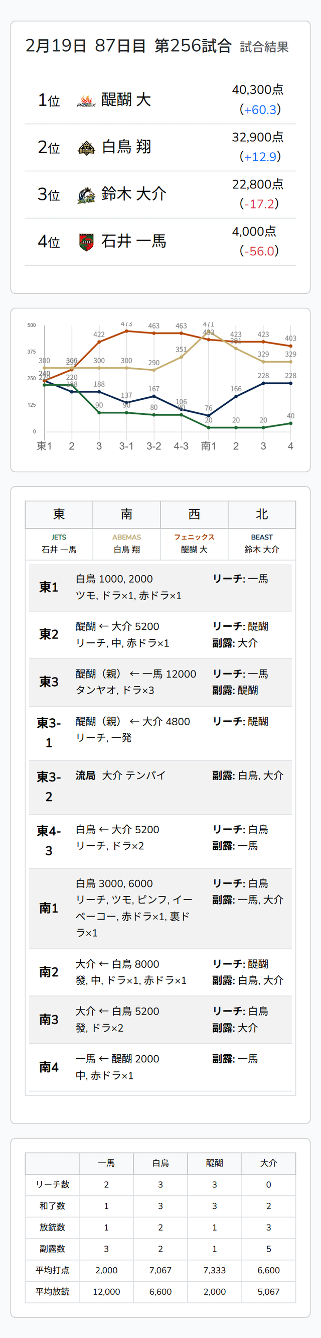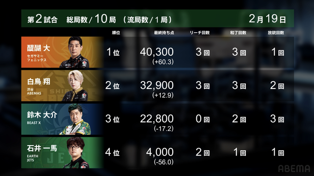 Mリーグ試合速報 2/19 麻雀2ch 第2試合【一馬・白鳥・醍醐・大介】麻雀ウォッチ編集部2026年2月19日Mリーグ速報 第1試合結果記事 【2/19 Mリーグ2025-26 第1試合結果】麻雀chは高打点のシーソーゲームを制した伊達朱里紗がトップ!麻雀2chは門前ホンイツの親倍満を決めた三浦智博が大トップ獲得! 第2試合結果記事 【2/19 Mリーグ2025-26 第2試合結果】麻雀chは最終局面の大接戦を逃げ切った園田賢がトップ!麻雀2chは的確なゲームメイクを見せた醍醐大がトップ獲得! 第2試合詳細結果 ©ABEMA 第2試合終了時点のトータルランキング ©ABEMA ▼日程・結果 日程・結果【Mリーグ】-2025-26SEASON ▼選手・チーム成績スタッツ 成績・データ【Mリーグ 2025-26シーズン】 2026年2月19日Mリーグ試合速報 2/19 麻雀ch 第2試合【滝沢・永井・堀・園田】この記事のライター麻雀ウォッチ編集部麻雀界の最新ニュース、コラム、インタビュー、ランキング、スケジュールなど、麻雀に関するあらゆる情報を発信する日本最大級の麻雀ニュースサイトです。ライターの最新投稿2026年2月19日Mリーグ【2/19 Mリーグ2025-26 第2試合結果】麻雀chは最終局面の大接戦を逃げ切った園田賢がトップ...2026年2月19日Mリーグ【2/19 Mリーグ2025-26 第1試合結果】麻雀chは高打点のシーソーゲームを制した伊達朱里紗が...2026年2月19日Mリーグ速報Mリーグ試合速報 2/19 麻雀ch 第2試合【滝沢・永井・堀・園田】麻雀ウォッチ編集部の記事一覧
