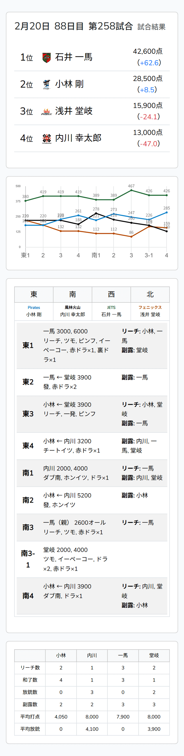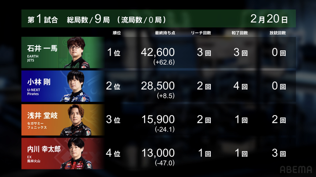 Mリーグ試合速報 2/20 麻雀2ch 第1試合【小林・内川・一馬・堂岐】麻雀ウォッチ編集部2026年2月20日Mリーグ速報 第1試合結果記事 【2/20 Mリーグ2025-26 第1試合結果】麻雀chは東4局に大連荘を決めた鈴木たろう、麻雀2chは東場にリードを広げた石井一馬がトップ獲得! 第2試合結果記事 【2/20 Mリーグ2025-26 第2試合結果】麻雀chは序盤から加点を重ねた本田朋広、麻雀2chは着実なアガリを重ねた内川幸太郎がトップ獲得! 第1試合詳細結果 ©ABEMA 第1試合終了時点のトータルランキング ©ABEMA ▼日程・結果 日程・結果【Mリーグ】-2025-26SEASON ▼選手・チーム成績スタッツ 成績・データ【Mリーグ 2025-26シーズン】 2026年2月20日Mリーグ試合速報 2/20 麻雀ch 第1試合【多井・下石・萩原・たろう】2026年2月20日Mリーグ試合速報 2/20 麻雀2ch 第2試合【三浦・小林・茅森・内川】この記事のライター麻雀ウォッチ編集部麻雀界の最新ニュース、コラム、インタビュー、ランキング、スケジュールなど、麻雀に関するあらゆる情報を発信する日本最大級の麻雀ニュースサイトです。ライターの最新投稿2026年2月20日Mリーグ【2/20 Mリーグ2025-26 第2試合結果】麻雀chは序盤から加点を重ねた本田朋広、麻雀2chは...2026年2月20日Mリーグ【2/20 Mリーグ2025-26 第1試合結果】麻雀chは東4局に大連荘を決めた鈴木たろう、麻雀2c...2026年2月20日Mリーグ速報Mリーグ試合速報 2/20 麻雀ch 第2試合【太・多井・下石・本田】麻雀ウォッチ編集部の記事一覧