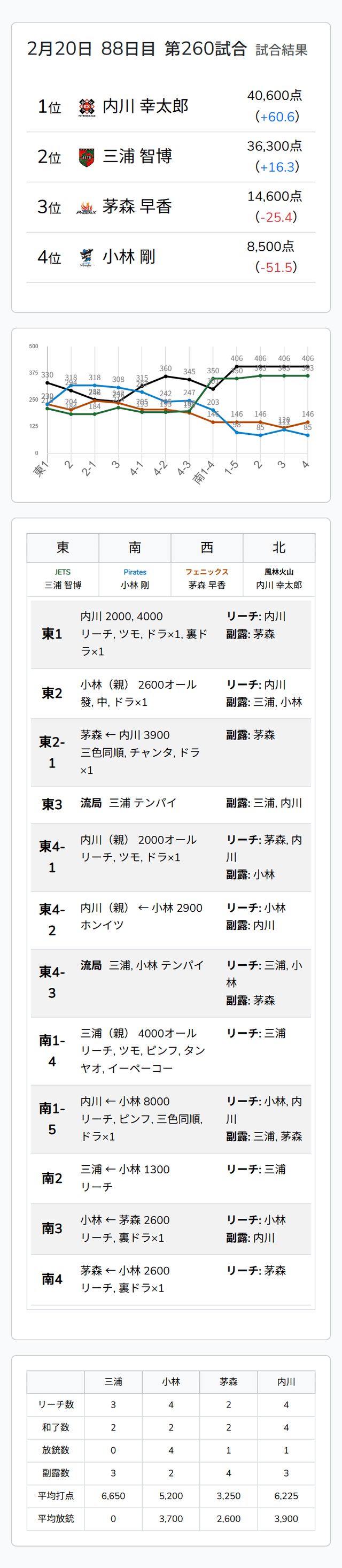 Mリーグ試合速報 2/20 麻雀2ch 第2試合【三浦・小林・茅森・内川】麻雀ウォッチ編集部2026年2月20日Mリーグ速報 第1試合結果記事 【2/20 Mリーグ2025-26 第1試合結果】麻雀chは東4局に大連荘を決めた鈴木たろう、麻雀2chは東場にリードを広げた石井一馬がトップ獲得! 第2試合結果記事 【2/20 Mリーグ2025-26 第2試合結果】麻雀chは序盤から加点を重ねた本田朋広、麻雀2chは着実なアガリを重ねた内川幸太郎がトップ獲得! 第2試合詳細結果 ©ABEMA 第2試合終了時点のトータルランキング ©ABEMA ▼日程・結果 日程・結果【Mリーグ】-2025-26SEASON ▼選手・チーム成績スタッツ 成績・データ【Mリーグ 2025-26シーズン】 2026年2月20日Mリーグ試合速報 2/20 麻雀2ch 第1試合【小林・内川・一馬・堂岐】2026年2月20日Mリーグ試合速報 2/20 麻雀ch 第2試合【太・多井・下石・本田】この記事のライター麻雀ウォッチ編集部麻雀界の最新ニュース、コラム、インタビュー、ランキング、スケジュールなど、麻雀に関するあらゆる情報を発信する日本最大級の麻雀ニュースサイトです。ライターの最新投稿2026年3月12日Mリーグ渡辺太 VS 永井孝典 VS 堀慎吾 VS 多井隆晴 セミファイナル進出に向けてABEMAS、サクラナ...2026年3月10日Mリーグ【3/10 Mリーグ2025-26 第2試合結果】次々と高打点をツモった渋川難波が特大トップ!サクラナ...2026年3月10日Mリーグ【3/10 Mリーグ2025-26 第1試合結果】トップを巡る熾烈な攻防!随所に大トップを目指して攻め...麻雀ウォッチ編集部の記事一覧
