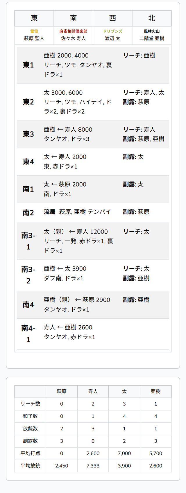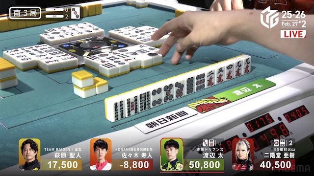 を仕掛けてテンパイを入れる中、トップ目で親の太がリーチをかけて前に出る。しかし、亜樹が太からロンアガリ。この直撃でトップ目と2着目が入れ替わる。