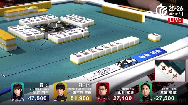 トップ目の瀬戸熊選手が仕掛けて聴牌!