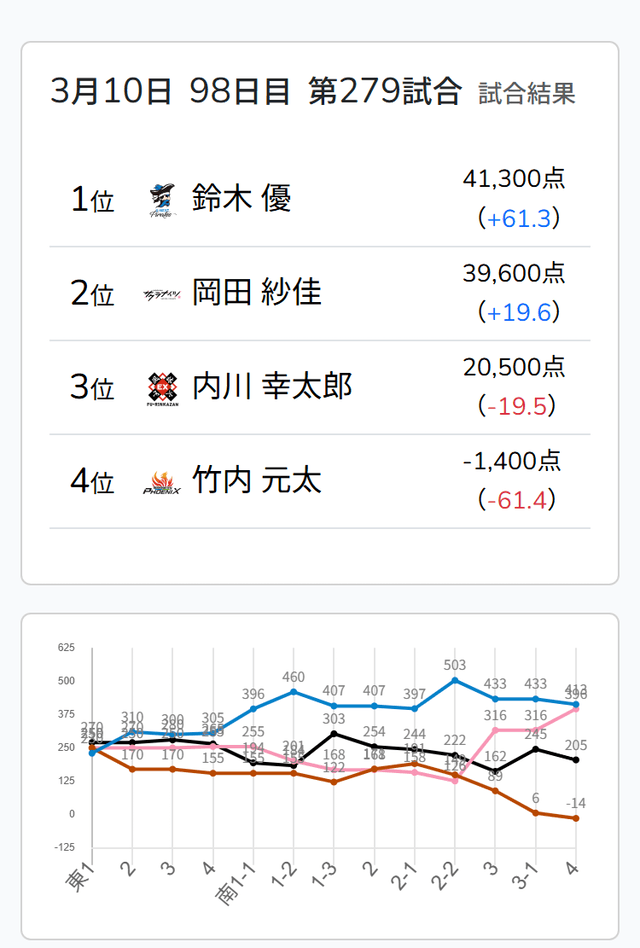 にロンの声をかけたのは優。4800は5400を手にし、リードを広げてさらなる連荘に成功した。