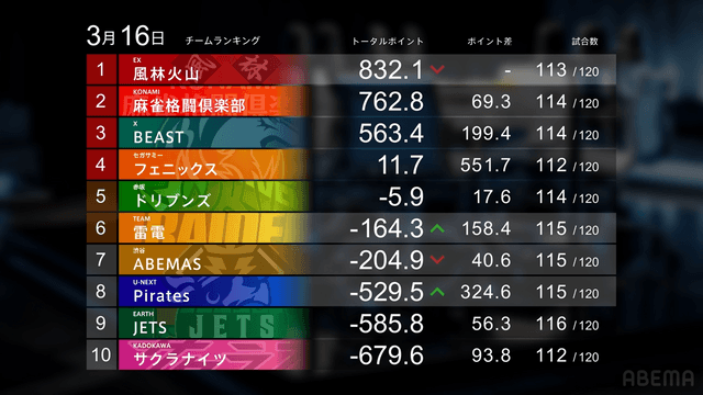 が放たれて優の倍満のアガリで終局。ABEMASの着順を落としたことも大きく、Piratesはセミファイナル進出に希望を残すトップとなった。