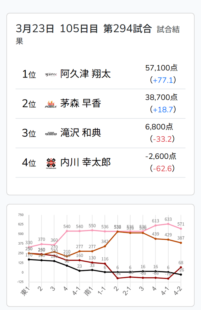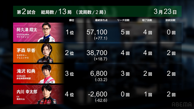 Mリーグ試合速報 3/23 第2試合【内川・茅森・滝沢・阿久津】